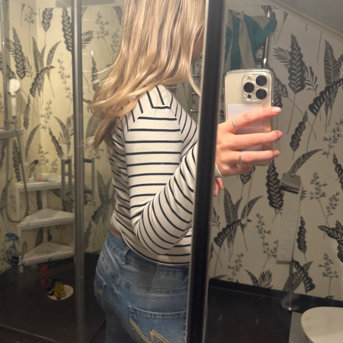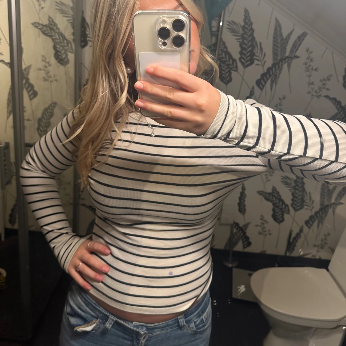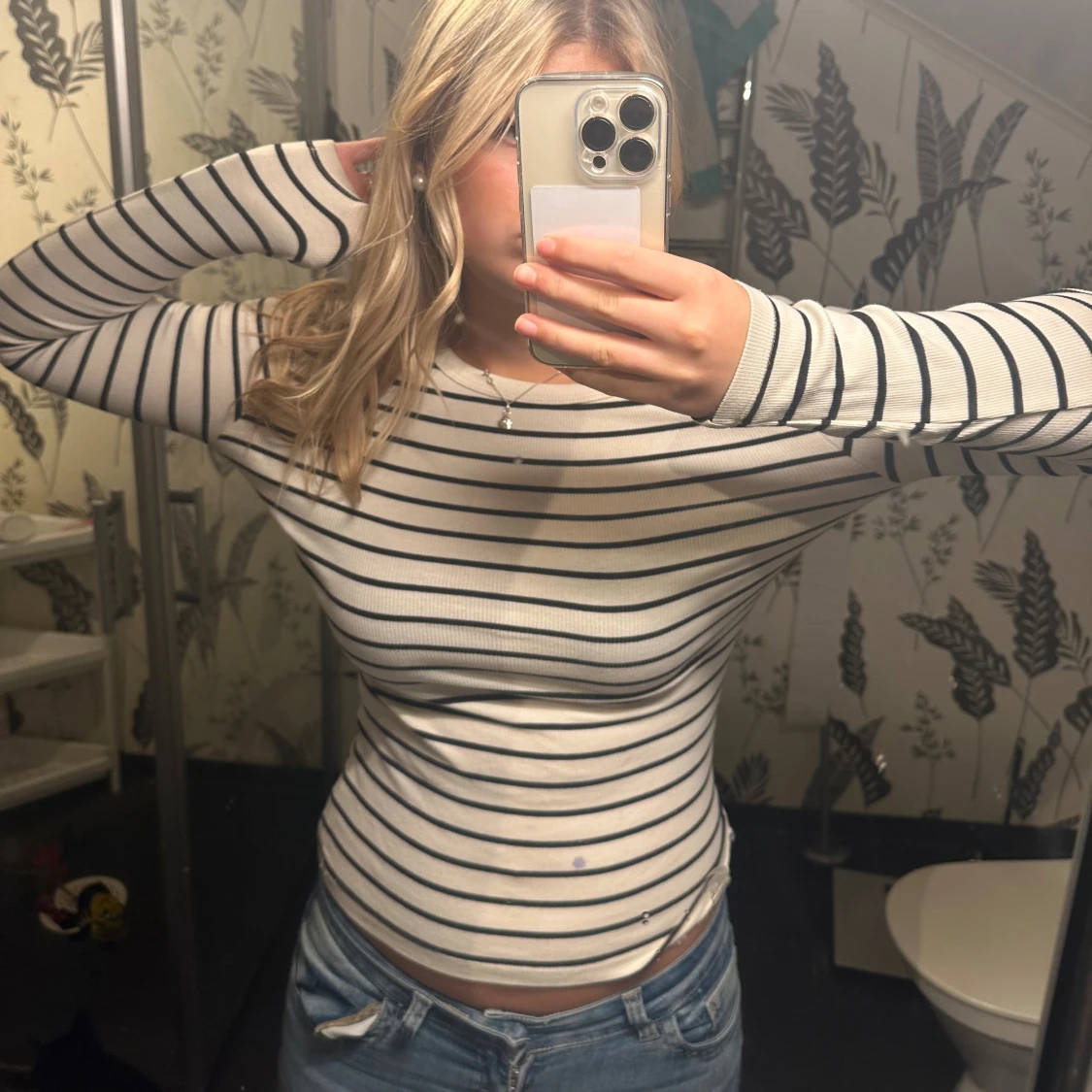 Säljer en vit långärmad tröja med svarta horisontella ränder. Tröjan har en rund halsringning och sitter tight mot kroppen. Perfekt att matcha med jeans eller kjol för en clean och fräsch look. Materialet känns mjukt och stretchigt. Har dock en liten Silverschampoo fläck.