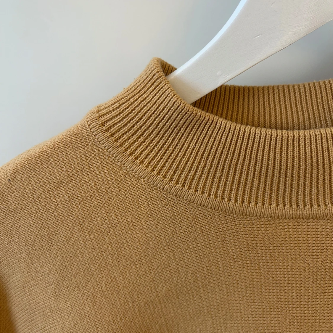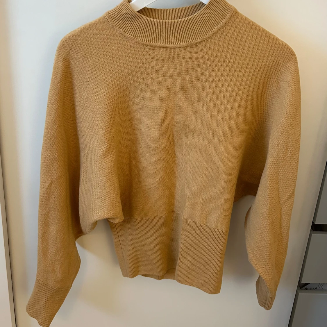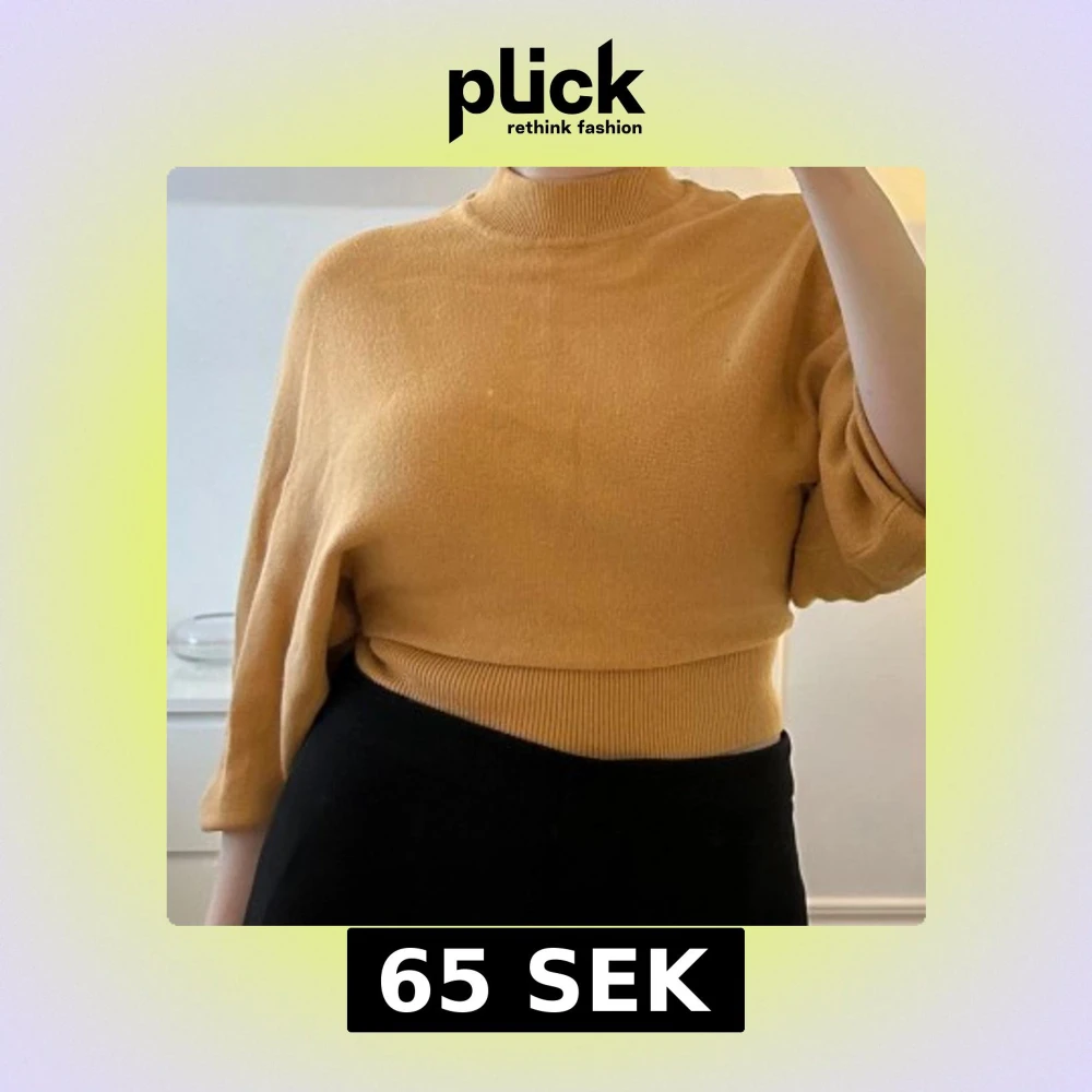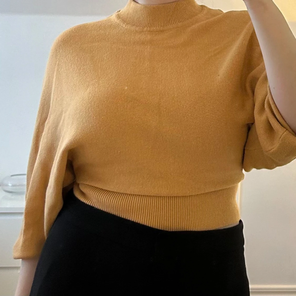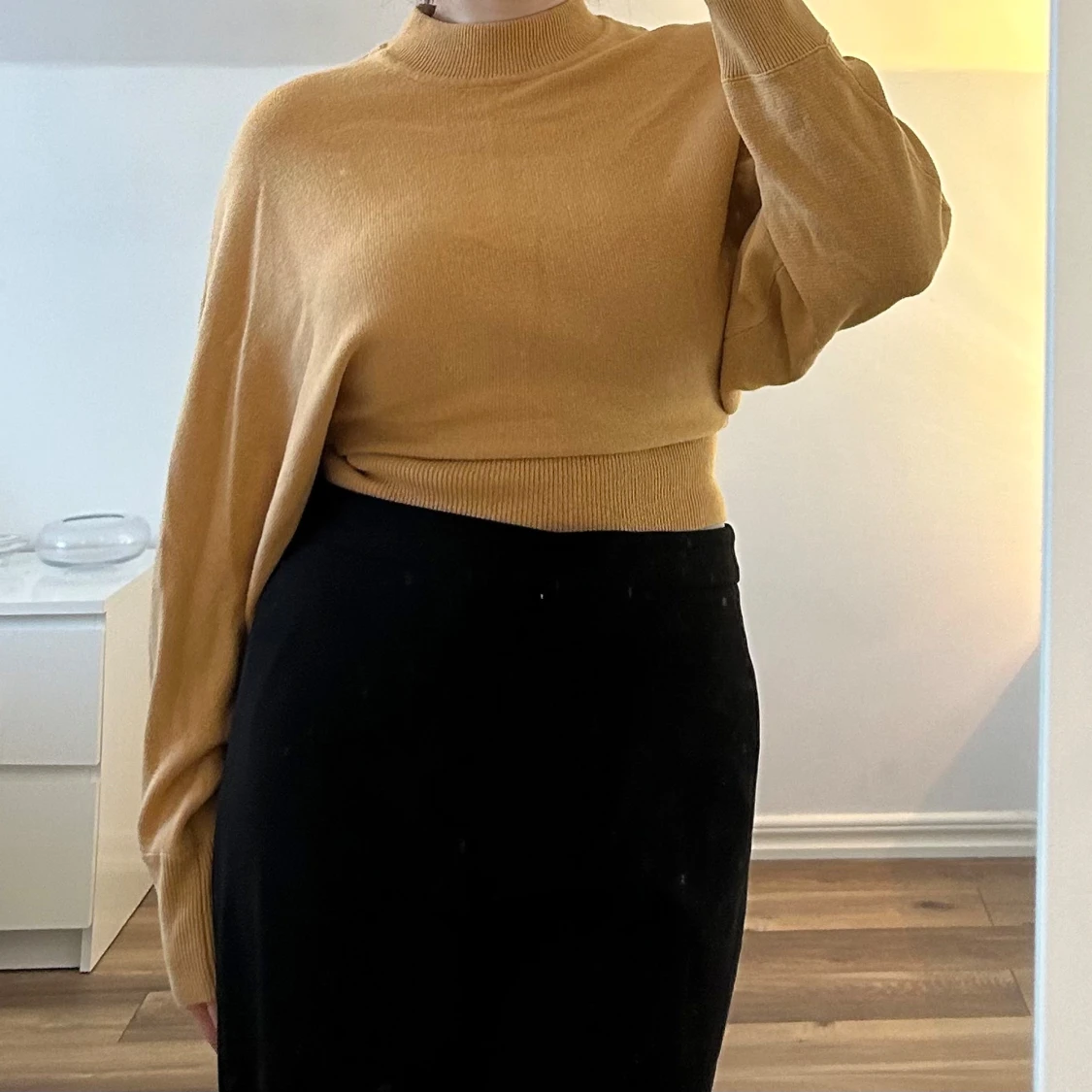 Säljer en senapsgul stickad tröja med hög hals och bred ribbad mudd i midjan. Tröjan har lång ärm. Sparsamt använd.