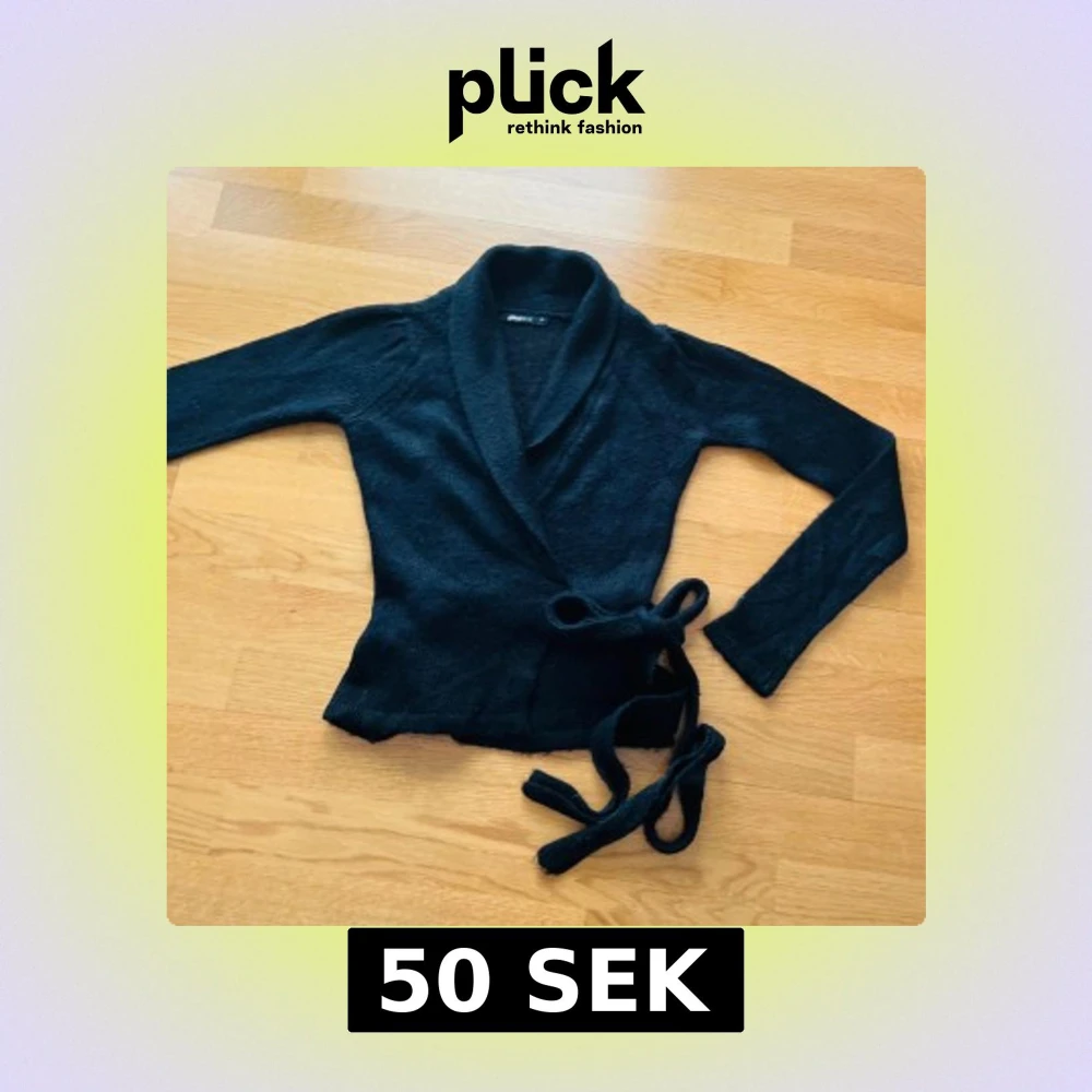 Mysig svart stickad omlottkofta från Gina Tricot med långa ärmar och bred krage. Koftan knyts i midjan med ett matchande band för en snygg och feminin siluett. Perfekt att slänga på sig när det är lite kyligare ute.