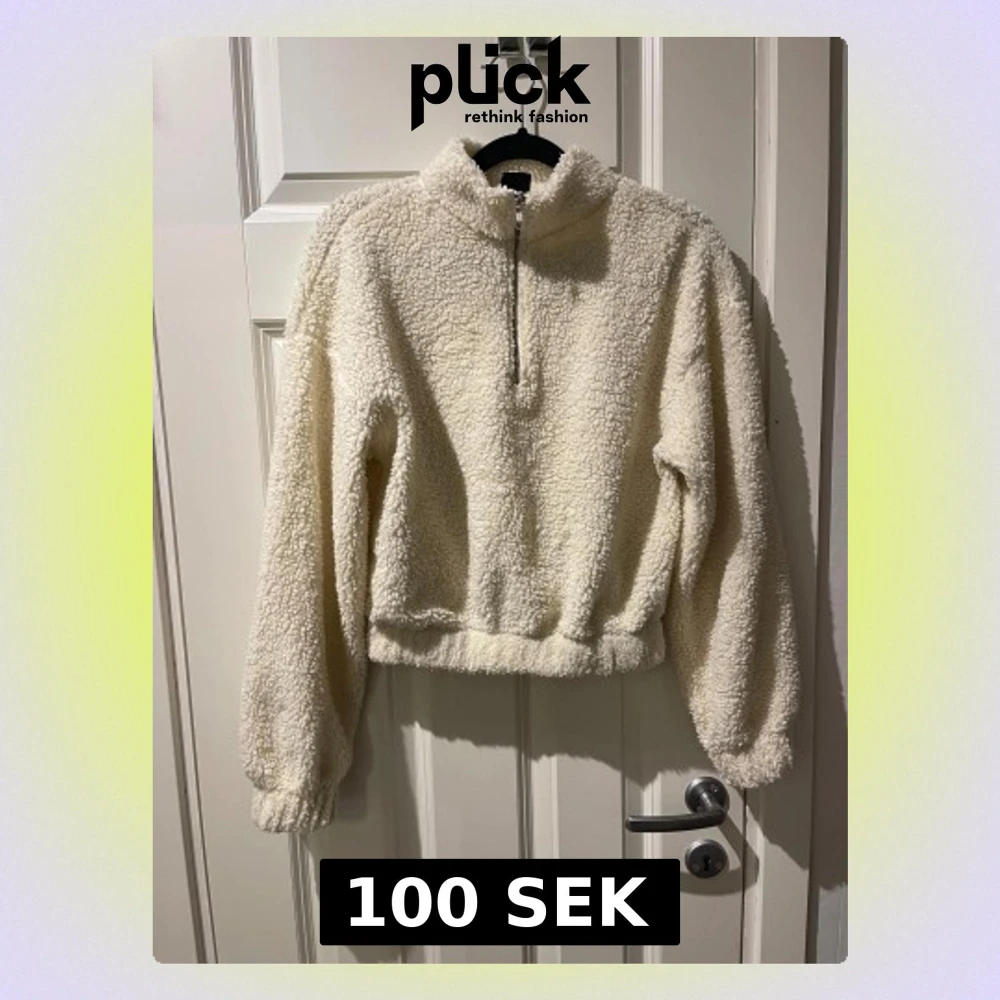 Mysig och fluffig vit fleece-tröja från Gina Tricot i storlek XS. Tröjan har en hög krage och en half zip-dragkedja framtill. Långärmad modell med elastisk nederkant och ärmslut, perfekt för kyliga dagar.