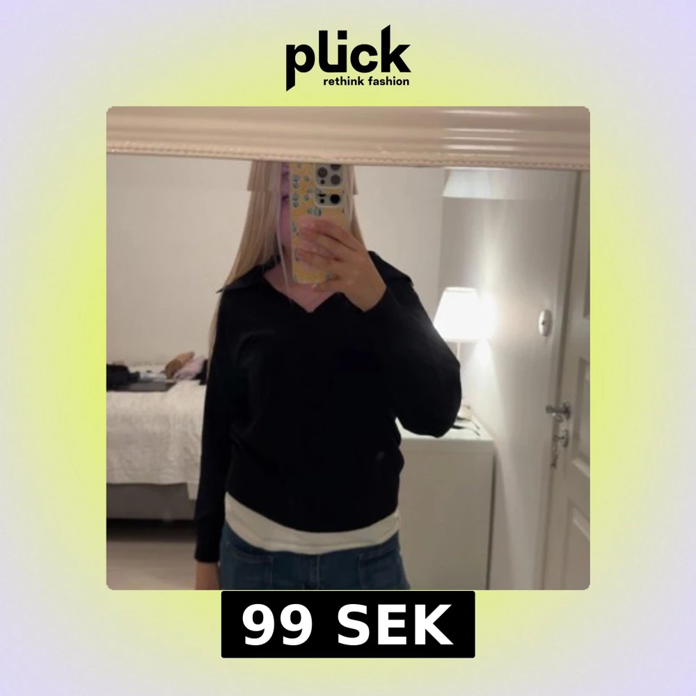 Svart stickad tröja från Gina Tricot i storlek XS. Tröjan har en snygg v-ringning och bred krage som ger en trendig look. Långärmad och i mjukt material, perfekt till jeans eller kjol.