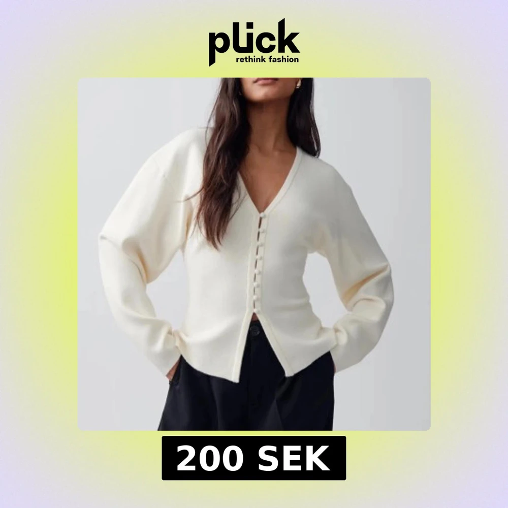 Säljer en stilren krämvit kofta med v-ringning och knappar framtill. Tröjan har lång ärm och en något lös passform, perfekt att styla till både jeans och kjol. Superenkel att matcha med andra plagg!