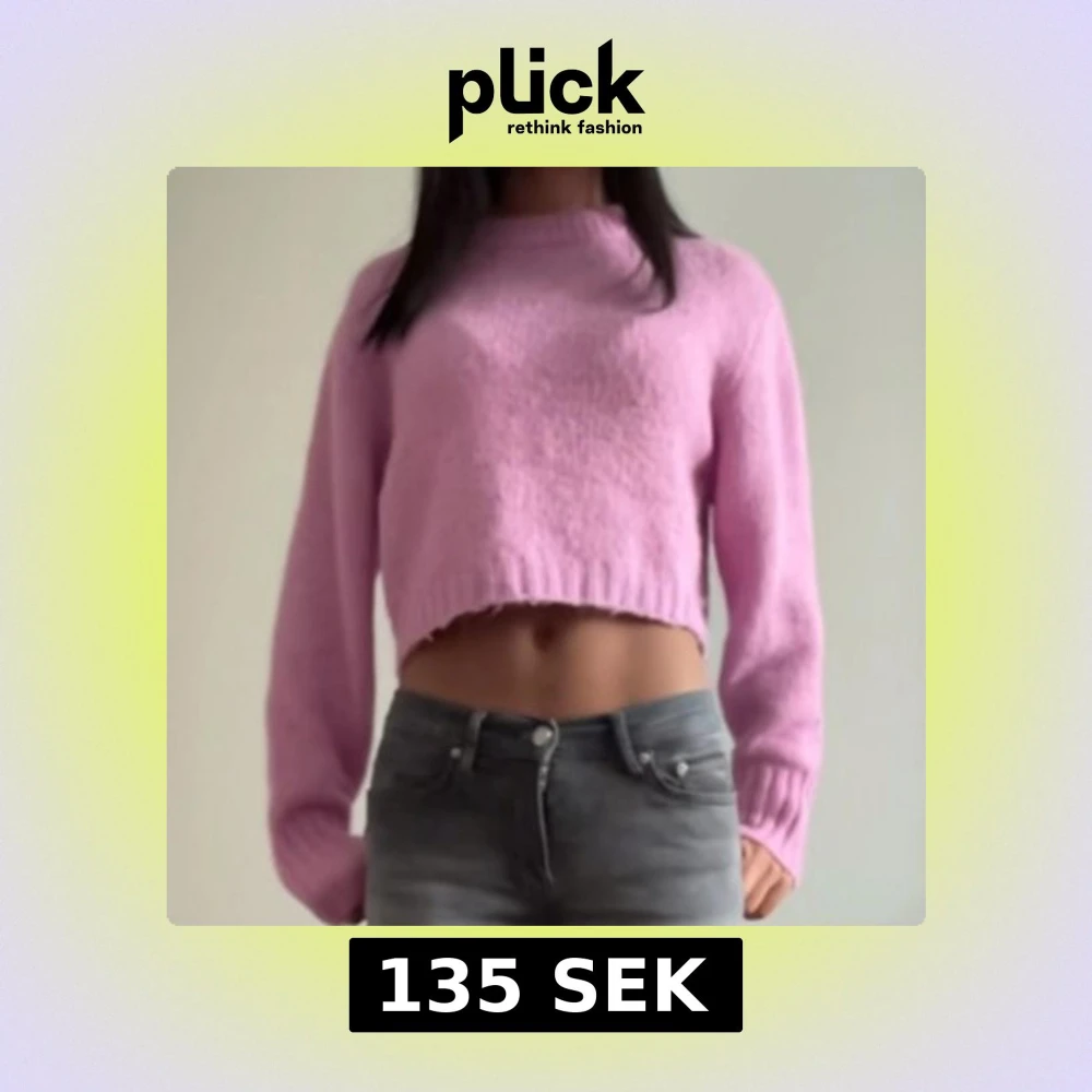 Säljer en ljusrosa croppad stickad tröja med lång ärm. Tröjan har en enkel design med ribbad nederkant och är perfekt för dig som gillar en avslappnad men trendig stil.