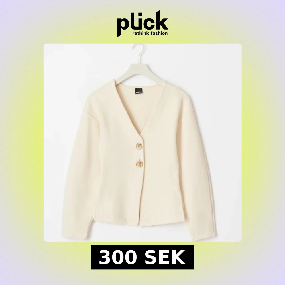 Snygg beige kofta från Ginatricot med v-ringning och dekorativa guldknappar. Perfekt för en stilren look. Långärmad och i ett mjukt material som ger en bekväm passform. Har dock inte använt den mer än 1 gång! Det sitter lite tajt via medjan!