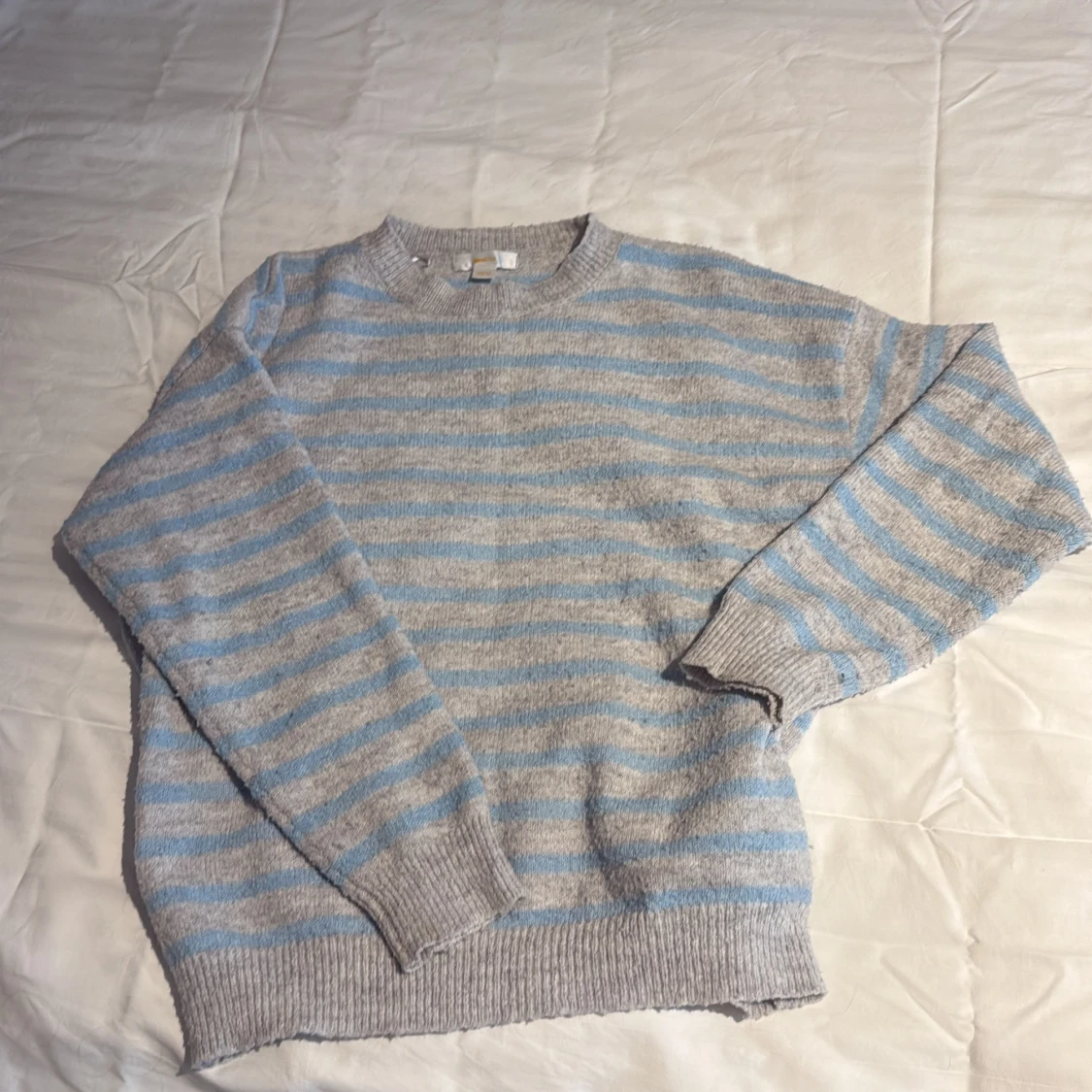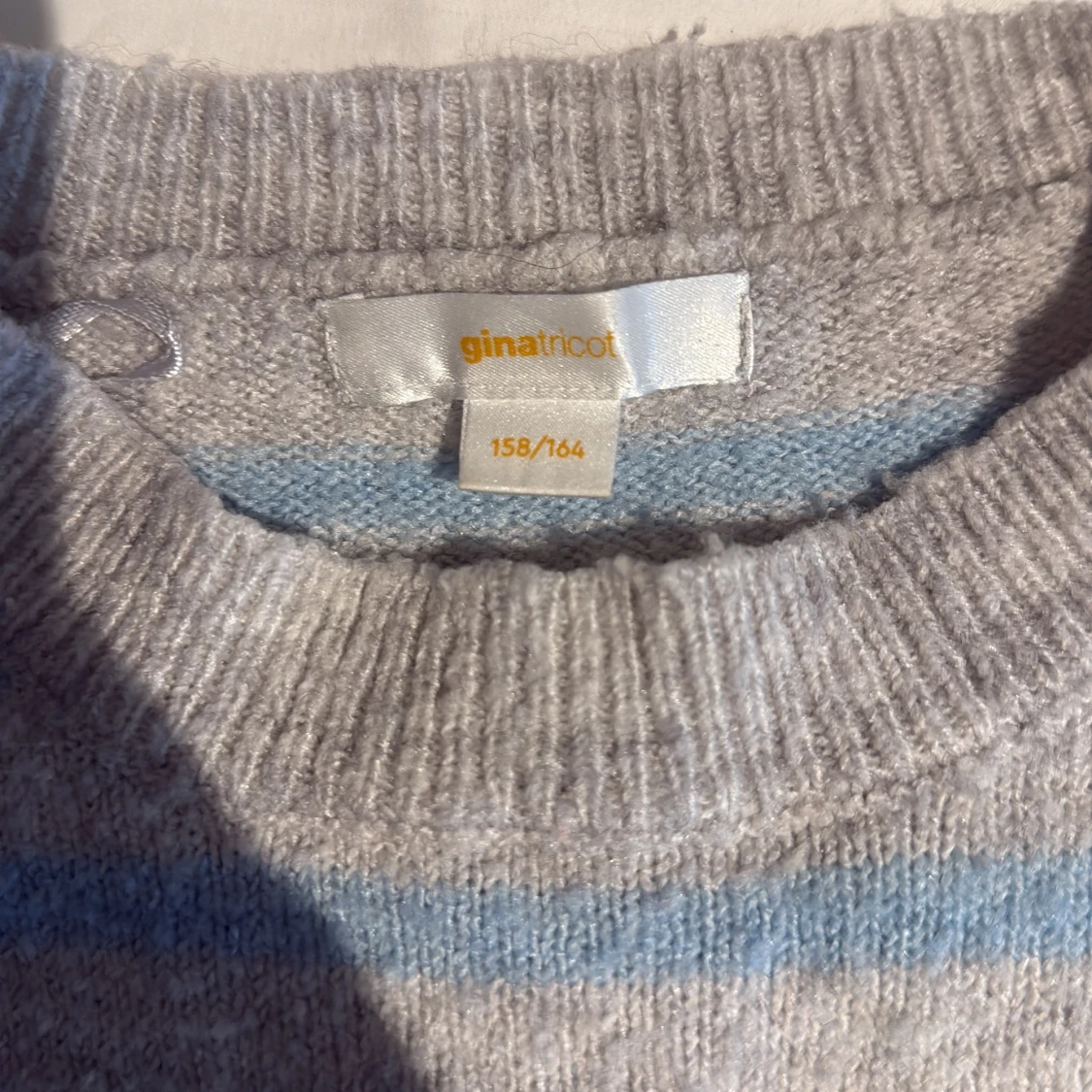 Mysig stickad tröja från Gina Tricot i grått och ljusblått med randigt mönster. Tröjan har rund halsringning, ribbade muddar och är långärmad. Perfekt för lager-på-lager under kyliga dagar.