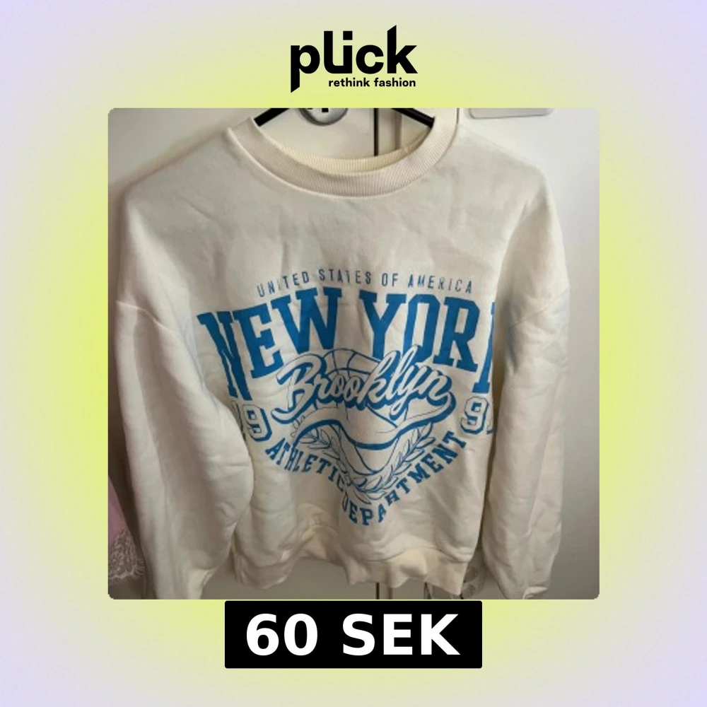 Säljer en vit sweatshirt med stort blått New York Brooklyn-tryck på framsidan.