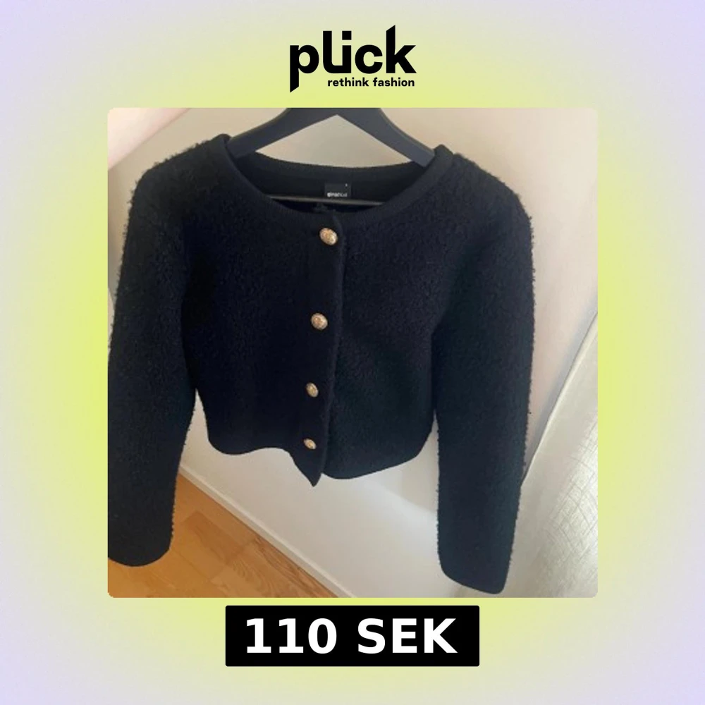 Snygg svart kofta från Gina Tricot med exklusiva guldknappar framtill. Koftan är i ett mjukt, stickat material och har lång ärm samt rund halsringning.