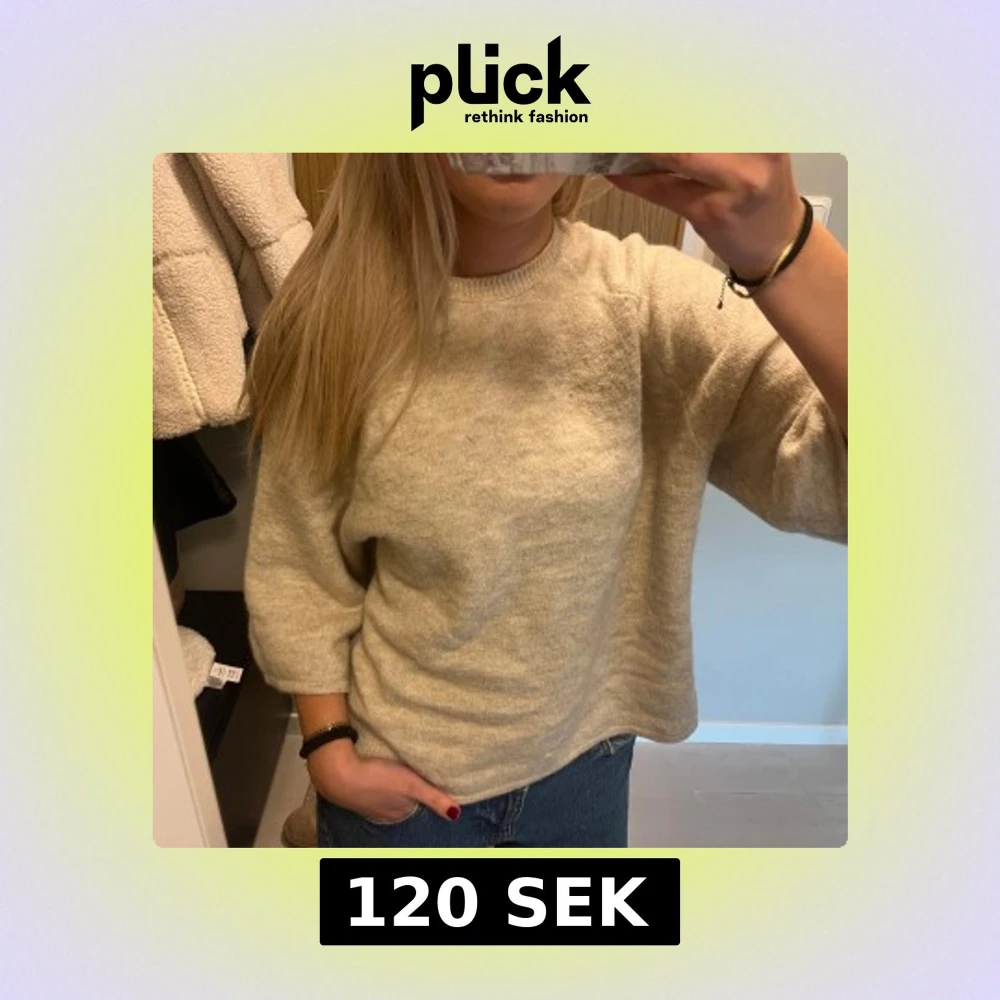 Mysig beige stickad tröja från Gina Tricot i storlek S. Tröjan har en rund halsringning och trekvartsärmar, perfekt att matcha med jeans eller kjol!!