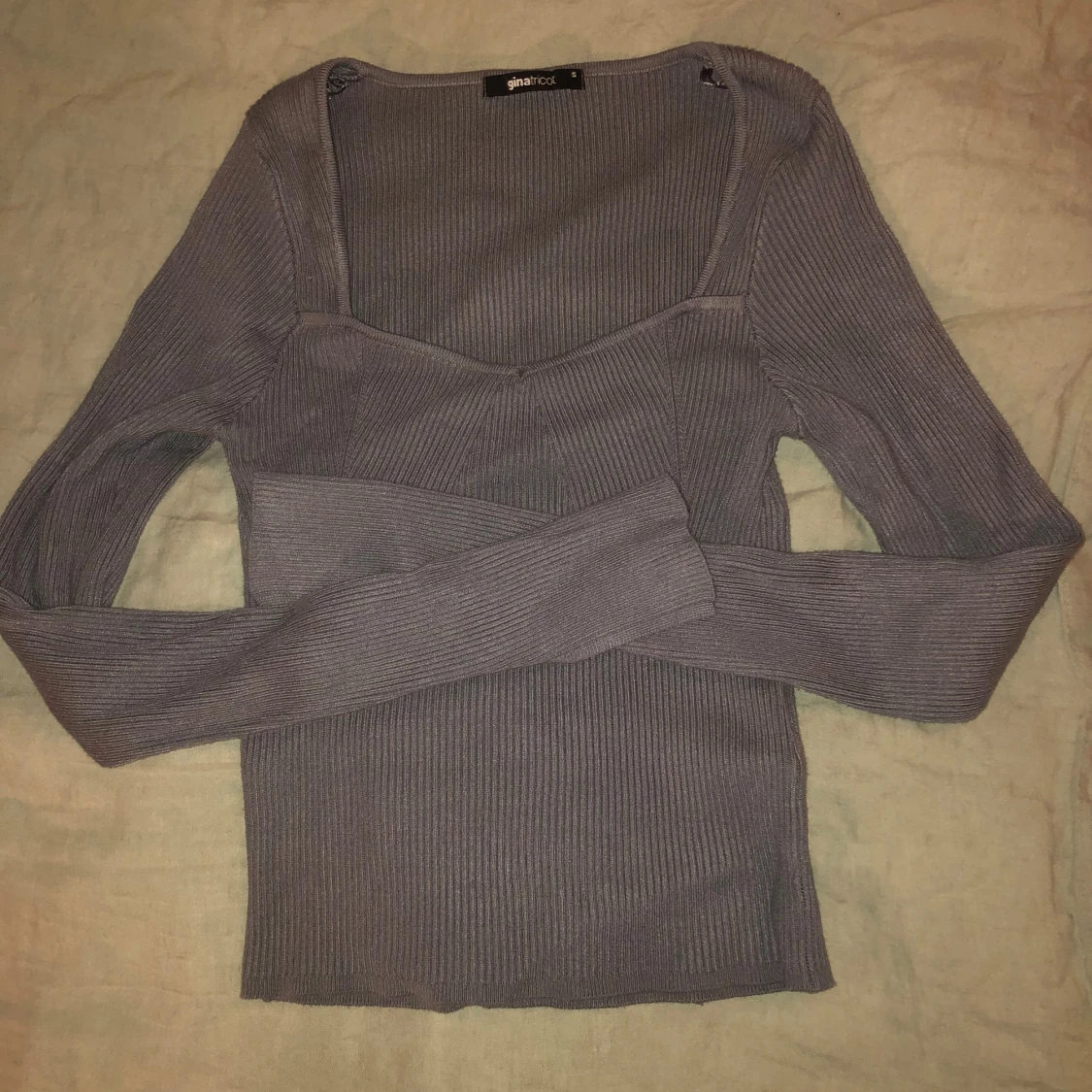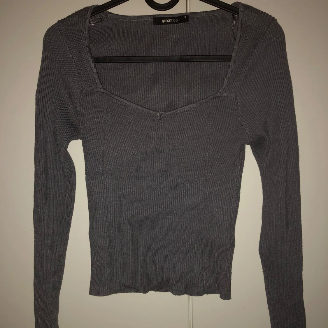 Grå ribbstickad tröja ifrån Gina tricot. Sparsamt använd utan defekter. Storlek s men skulle säga att den passar xs-m då den är väldigt stretchig. Hör av er vid frågor💗