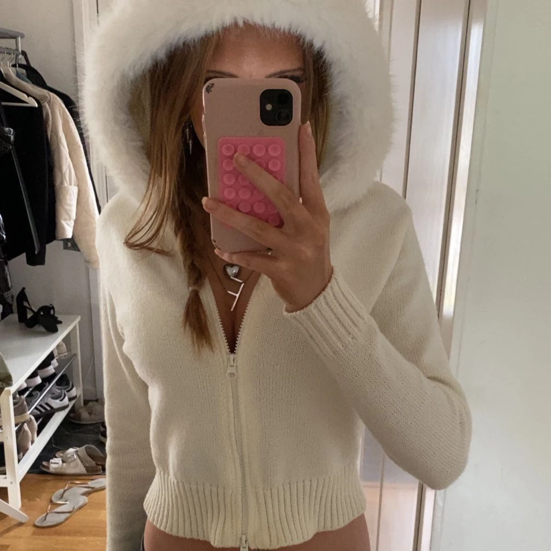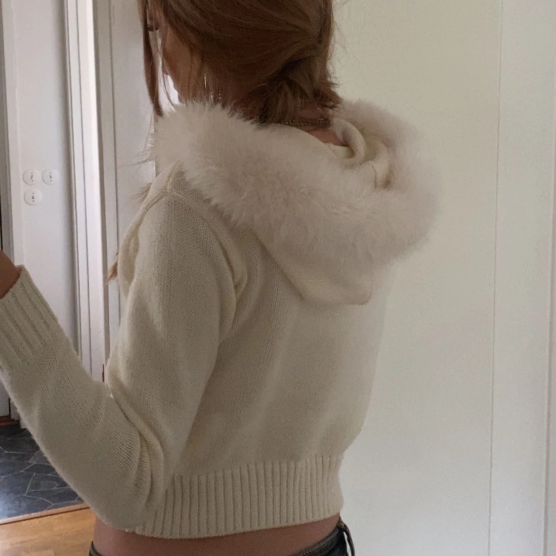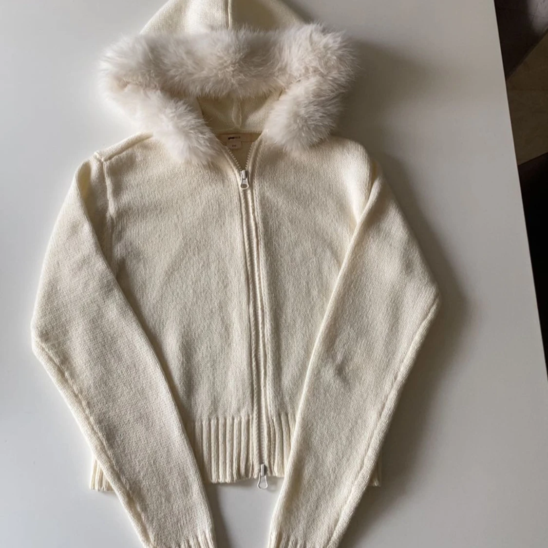Superfin vit stickad hoodie med dragkedja och fluffig päls på luvan från Gina Young 14+. Använd Max 3 gånger och har inga defekter alls, säljer pågrund av att jag inte använt den. pris kan diskuteras.