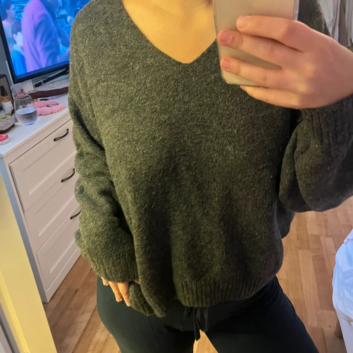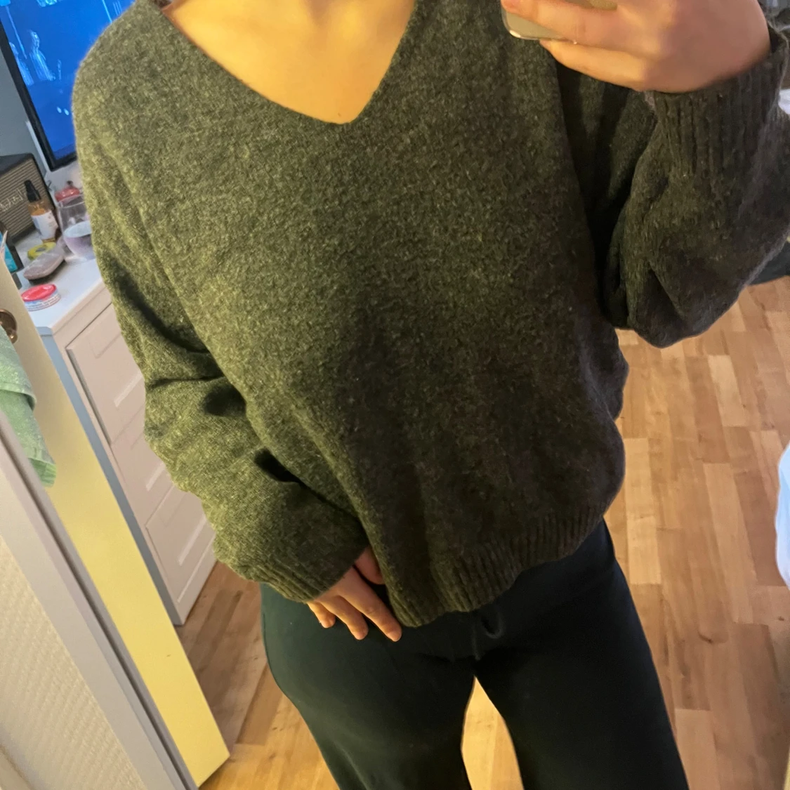 Mysig mörkgrå stickad tröja med v-ringning och långa ärmar. Tröjan har en relaxed passform och ribbade muddar vid ärmslut och nederkant. Perfekt för kyliga dagar och enkel att styla med dina favoritjeans eller mjukisbyxor.