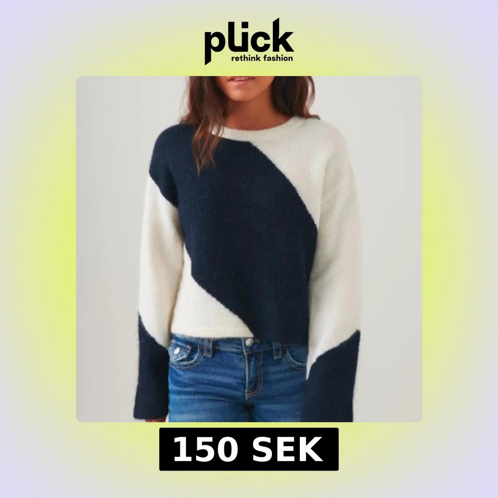 Säljer en snygg stickad tröja från Gina Tricot i marinblå och vitt med ett diagonalt mönster. Tröjan har långa ärmar och en rund halsringning. Perfekt för kyligare dagar! ❤️