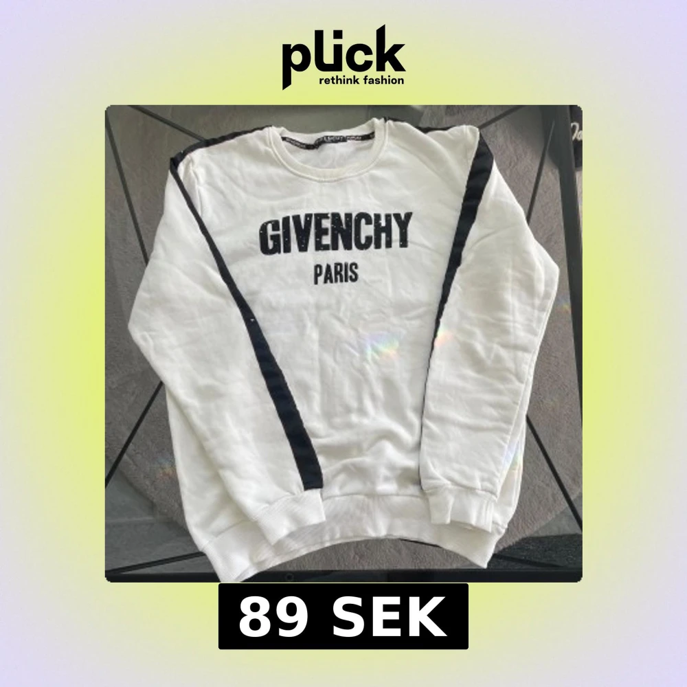 Säljer en stilren vit sweatshirt från Givenchy med svart text 'GIVENCHY PARIS' på framsidan. Tröjan har svarta detaljer längs ärmarna och ribbade muddar vid ärmslut och nederkant. Perfekt för en avslappnad och trendig look. Har tecken på använding och den är tillverkad i Turkiet.