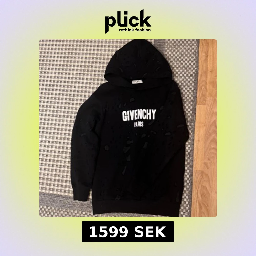 Svart hoodie från Givenchy Paris med vit logotyptryck på bröstet. Tröjan har huva och lång ärm, samt coola slitna detaljer och hål över hela tyget för en edgy vibe. Materialet är mjuk bomull och passformen är normal. Perfekt för dig som gillar streetwear och designer.