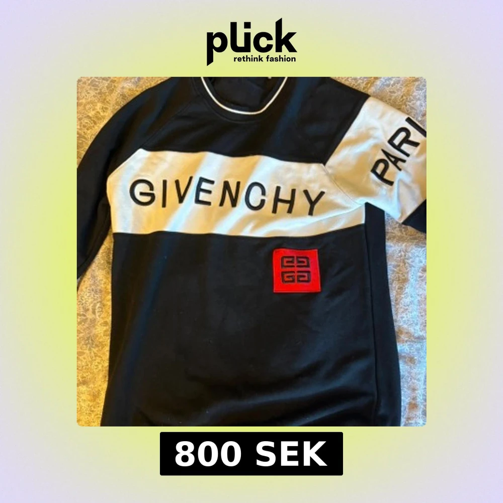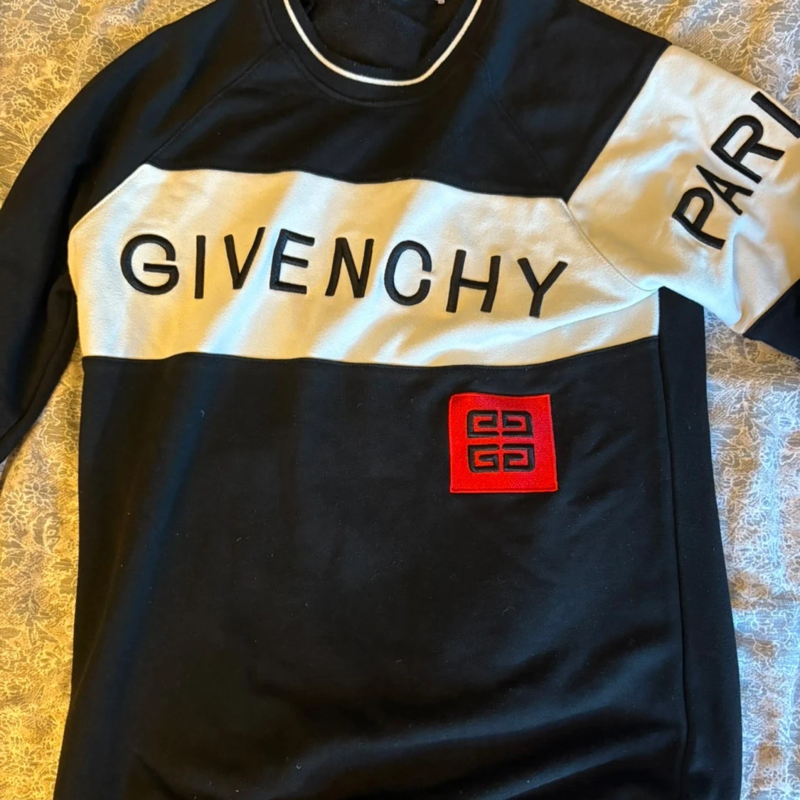 Svart och vit sweatshirt från Givenchy med stor logga över bröstet och ärmen samt röd patch med Givenchy-symbol på magen. Tröjan har rund halsringning med vit kant och långa ärmar. Perfekt för dig som gillar streetstyle och designerplagg.