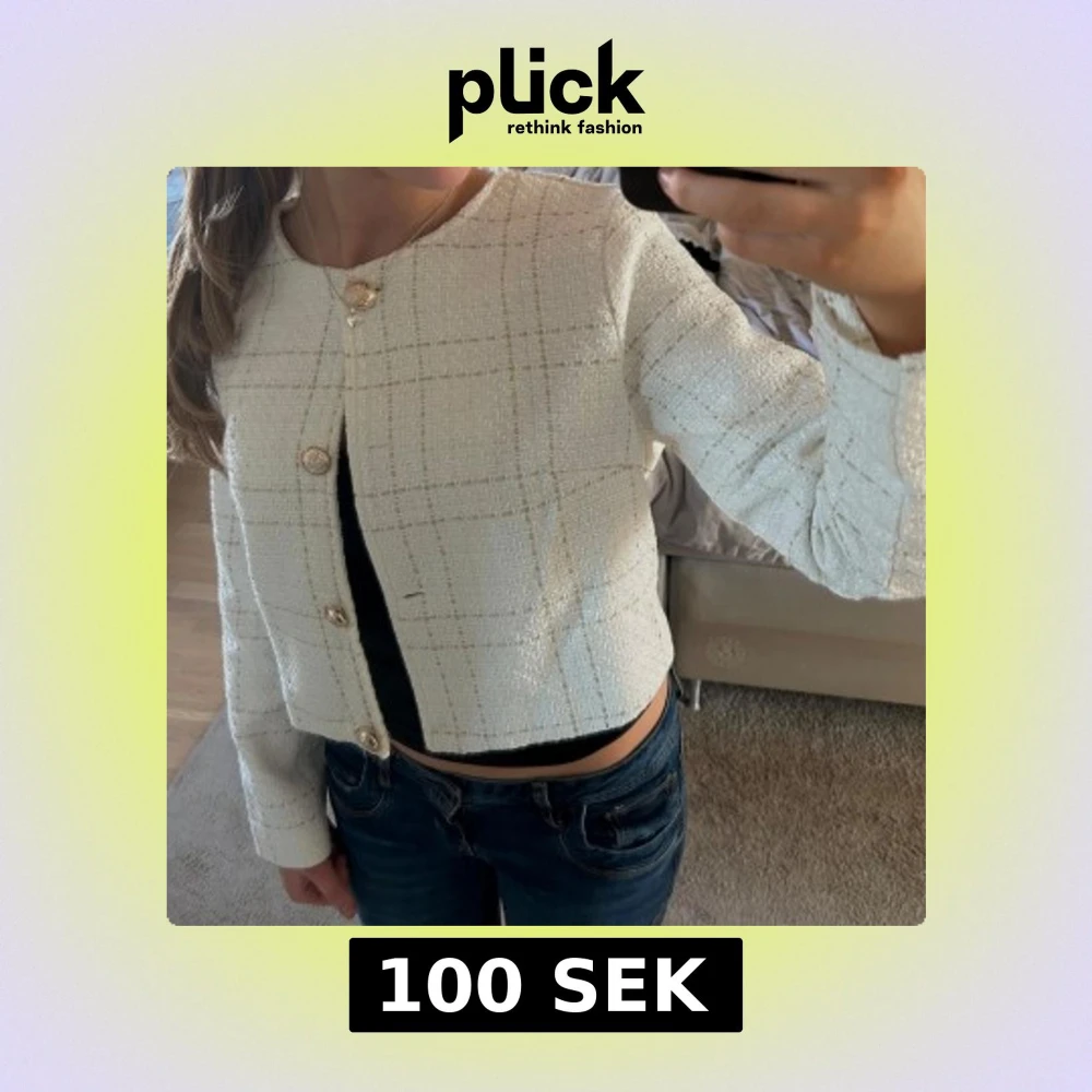 Säljer en elegant vit tröja med rutigt mönster och stiliga guldknappar❣️