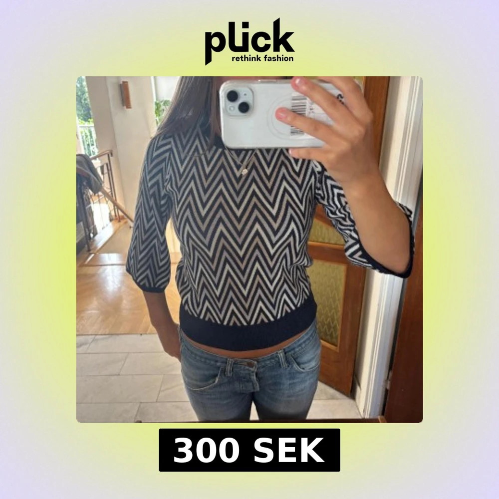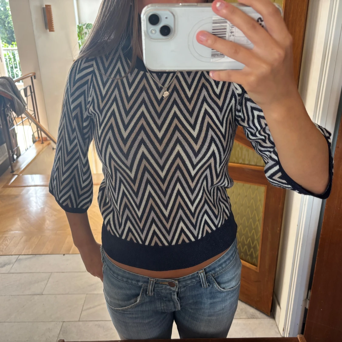 Säljer en snygg stickad tröja med blå glittrigt sicksackmönster och trekvartsärmar.