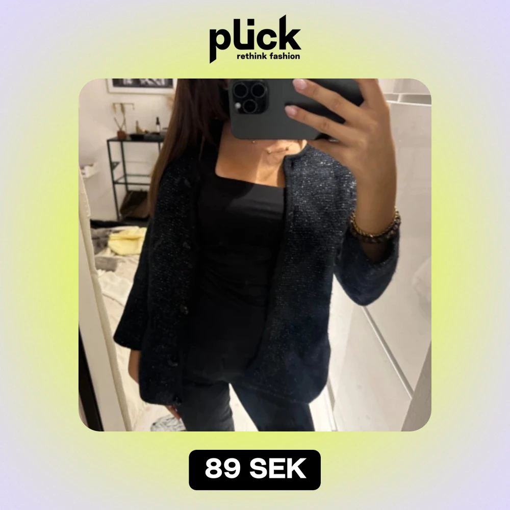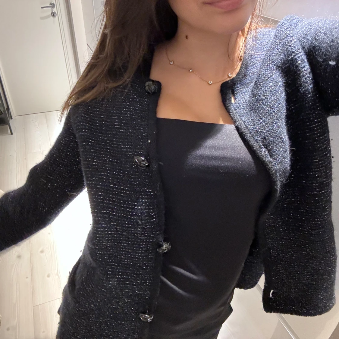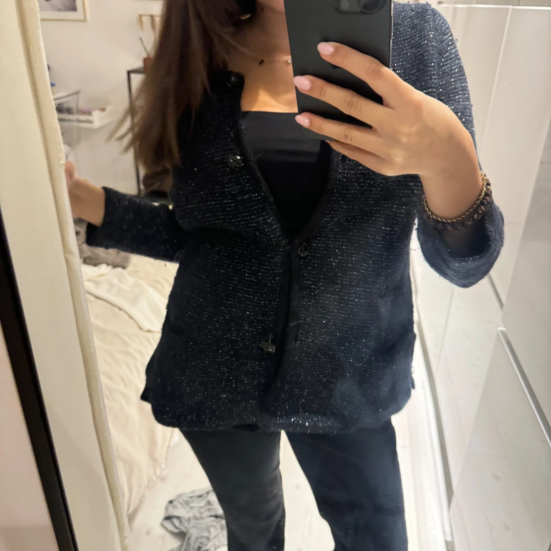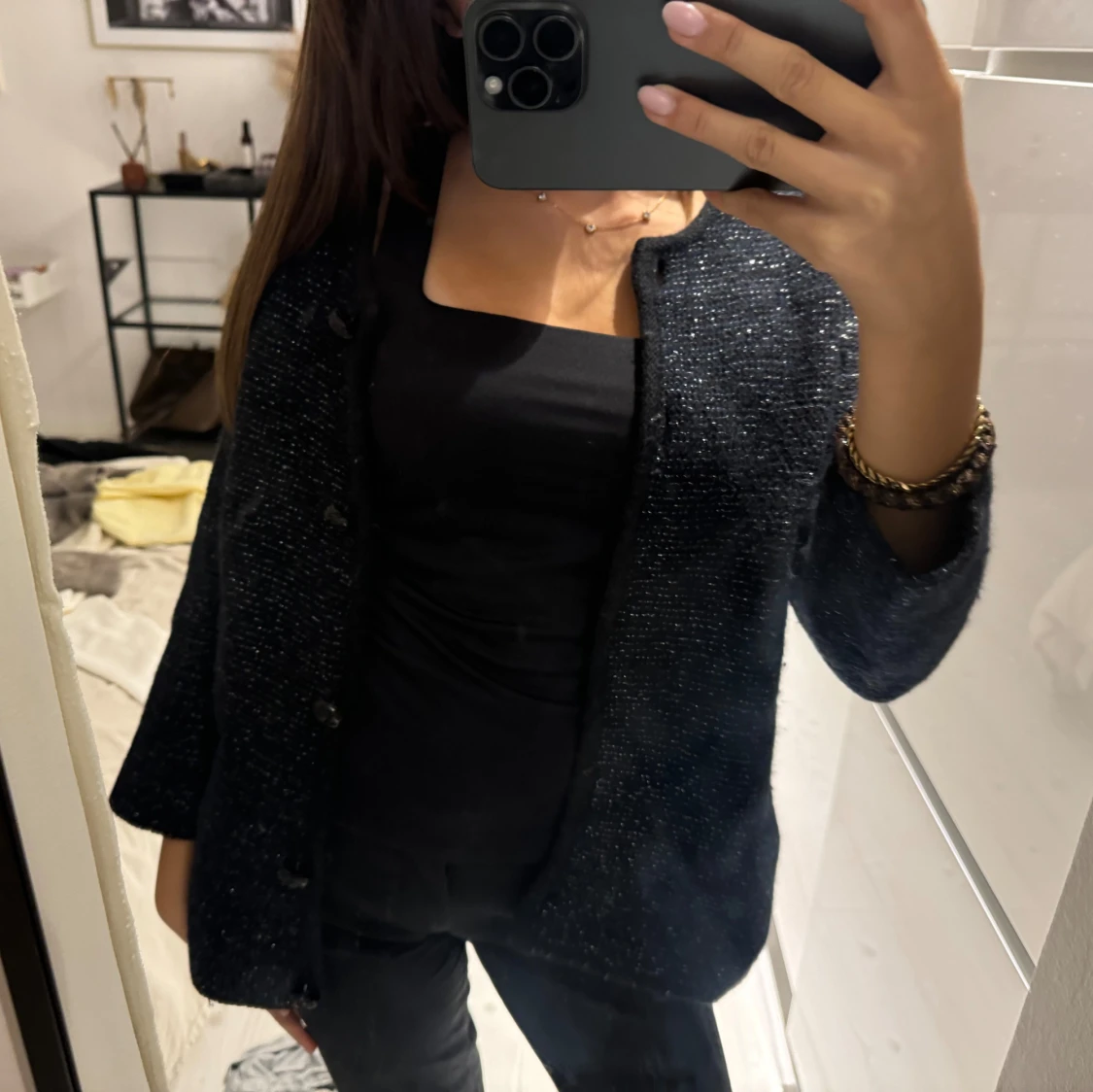 Superfin marin blå glittrig kofta som är köpt secondhand.