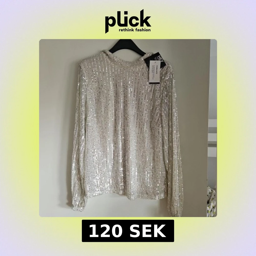 Superfin glittrig blus från nelly i silver med långa ärmar och paljetter över hela. Blusen har en rak passform och hög krage, perfekt för att sticka ut. Fodrad på insidan för extra komfort. Aldrig använd.
