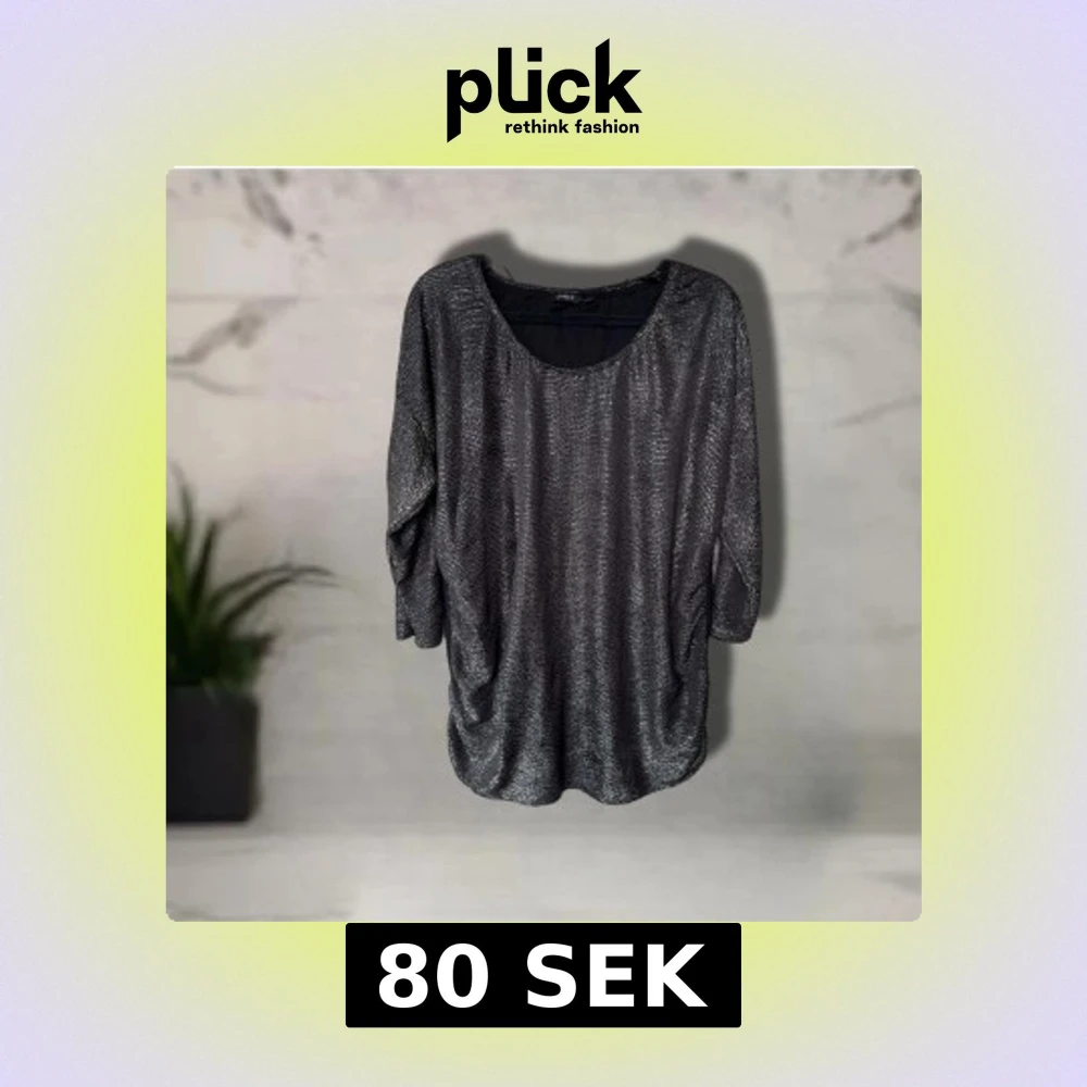 Säljer en glittrig svart topp från Lindex i storlek L. Toppen har en lös passform, rund halsringning och trekvartsärmar. Framsidan är skimrande med metallic-effekt medan baksidan är enfärgat svart tyg. Perfekt för dig som vill sticka ut lite extra.