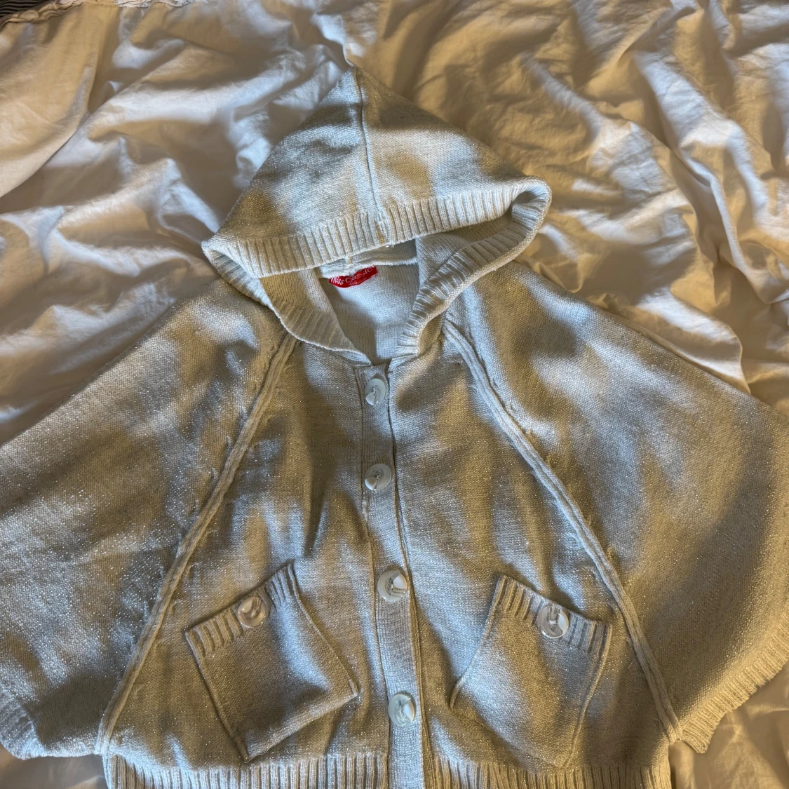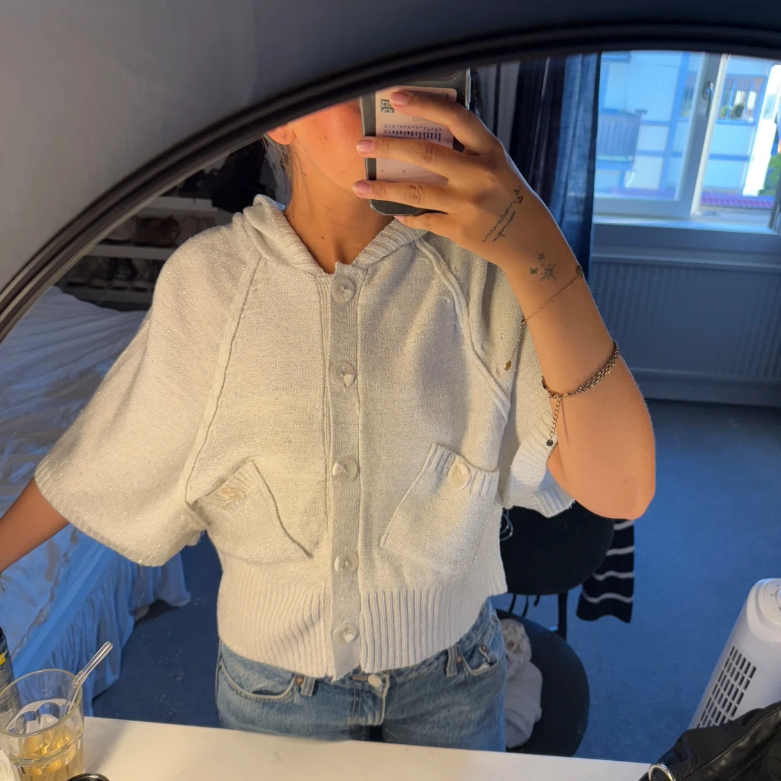 Säljer en vit glittrig hoodie från Miss Classic Collection med korta ärmar och knappar framtill. Tröjan har två fickor med knappdetaljer och ribbad kant vid midjan och huvan. Perfekt för dig som gillar chill och snygg stil med lite extra shine. Köpt här på plick men aldrig kommit till användning