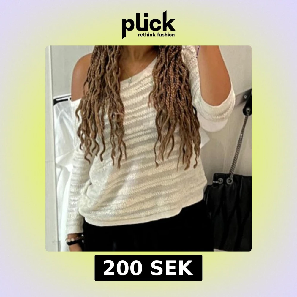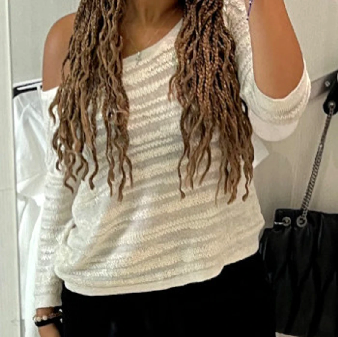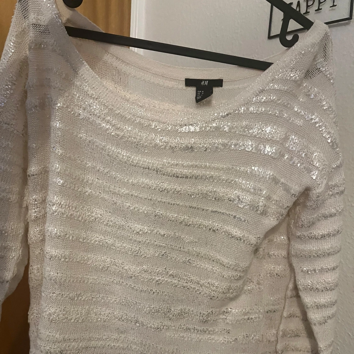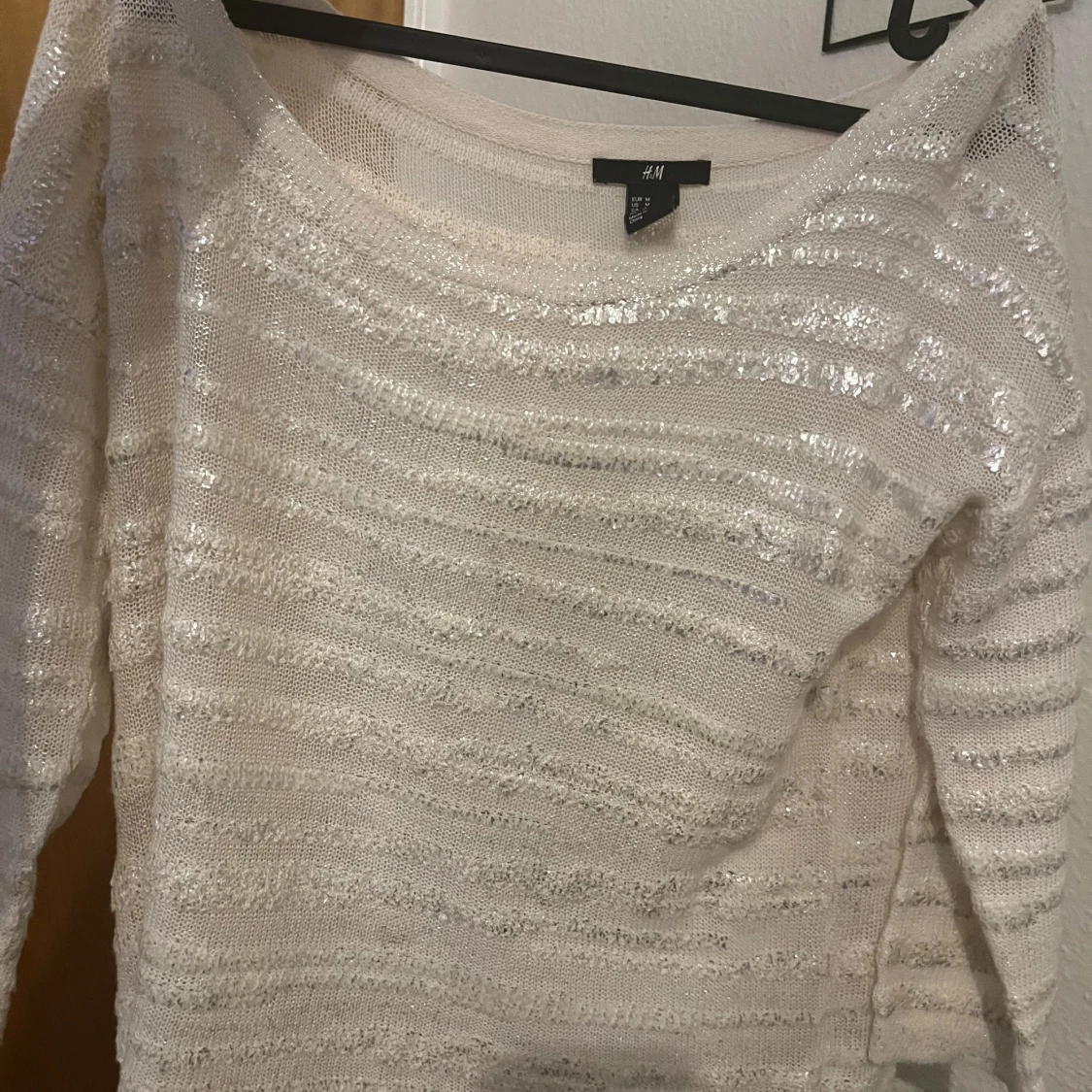 Supersöt vit stickad tröja från H&M med glittriga detaljer i hela tyget. Tröjan är off shoulder.
