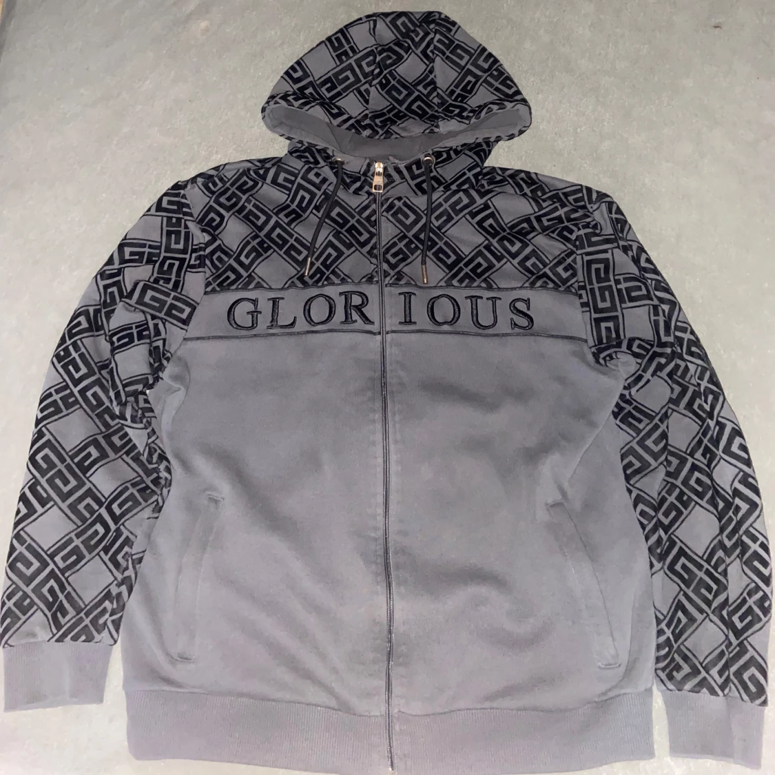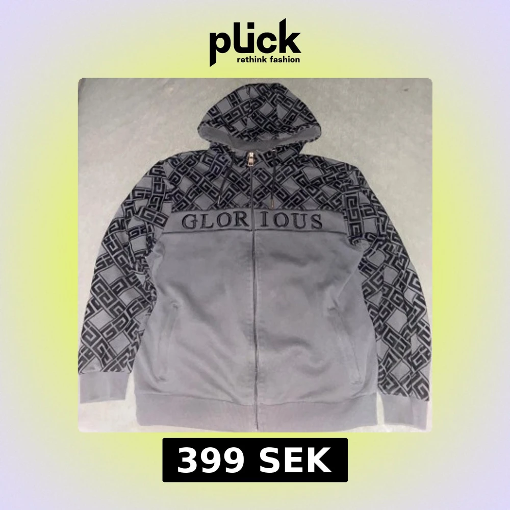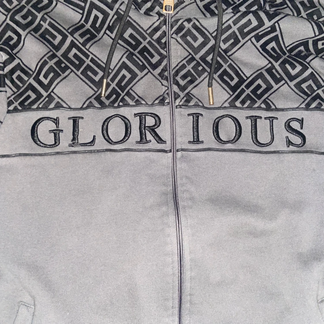 Snygg grå hoodie från Glorious med svart grafiskt mönster på ärmar och huva. Dragkedja framtill, broderad logga över bröstet och justerbar huva med snören. Perfekt för dig som gillar streetwear vibes.