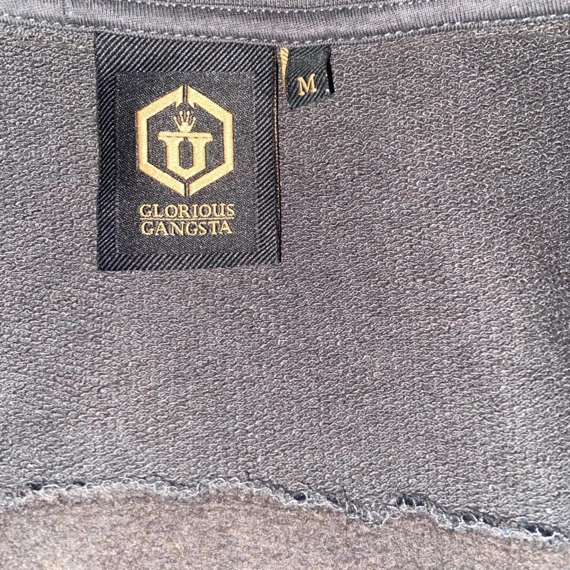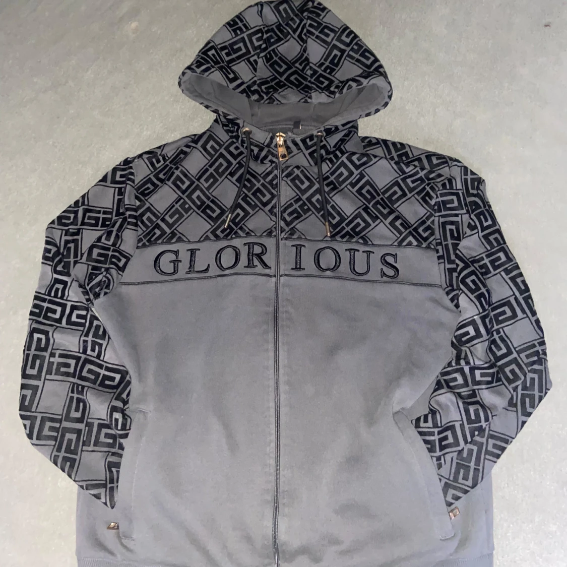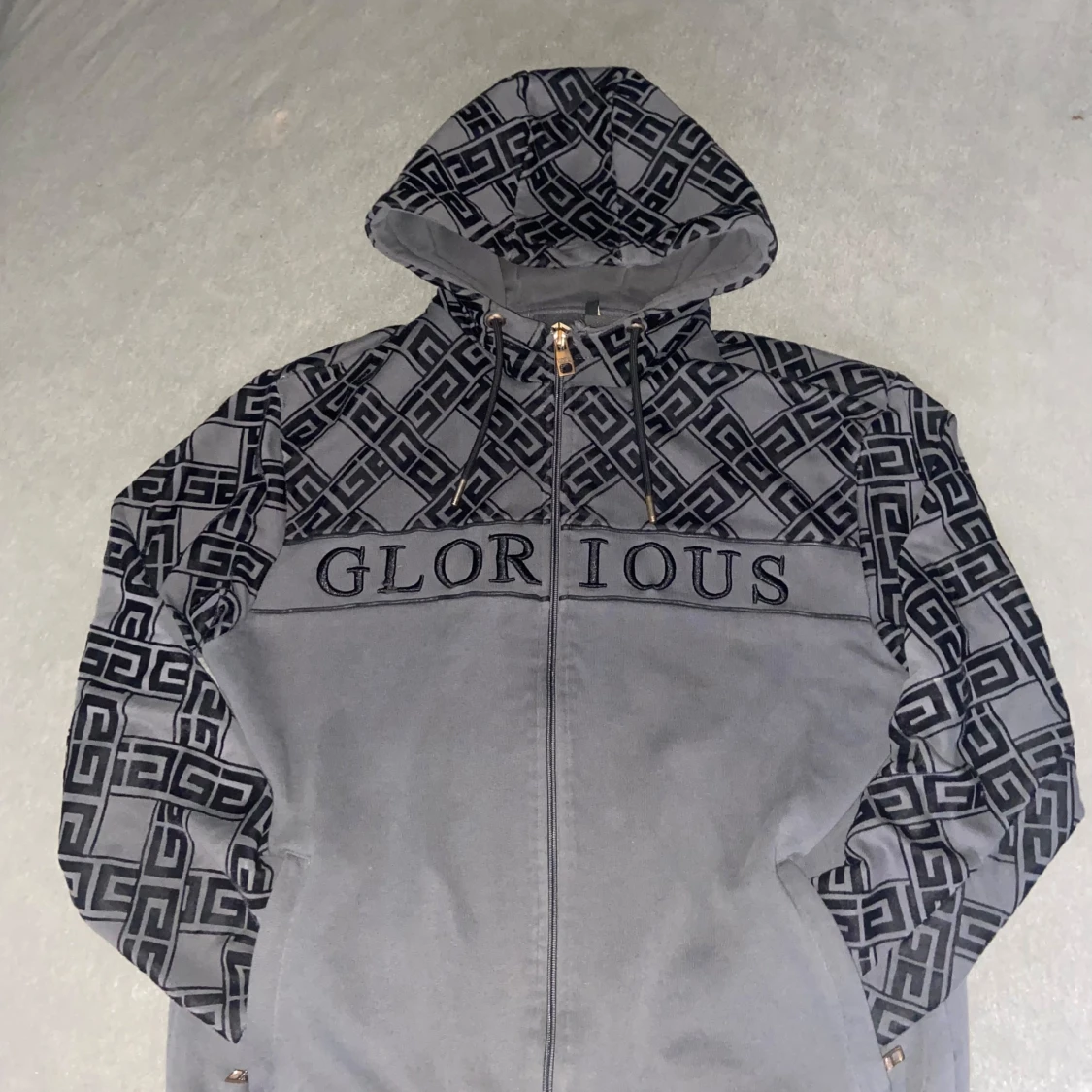 Snygg grå hoodie från Glorious med svart grafiskt mönster på ärmar och huva. Dragkedja framtill, broderad logga över bröstet och justerbar huva med snören. Perfekt för dig som gillar streetwear vibes.