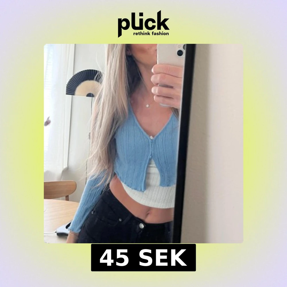 Ljusblå croppad kofta från Bershka, som ny! Använd EN gång. Storlek S. Stickad i ett mjukt, fluffigt material och har ribbade detaljer. V-ringad och två knappar framtill. 🩵Mått: Längd 37cm, midjevidd (knäppt): 73cm kan töjas ut till 114cm, armhåla-armhåla: 42cm, ärmlängd 59cm.