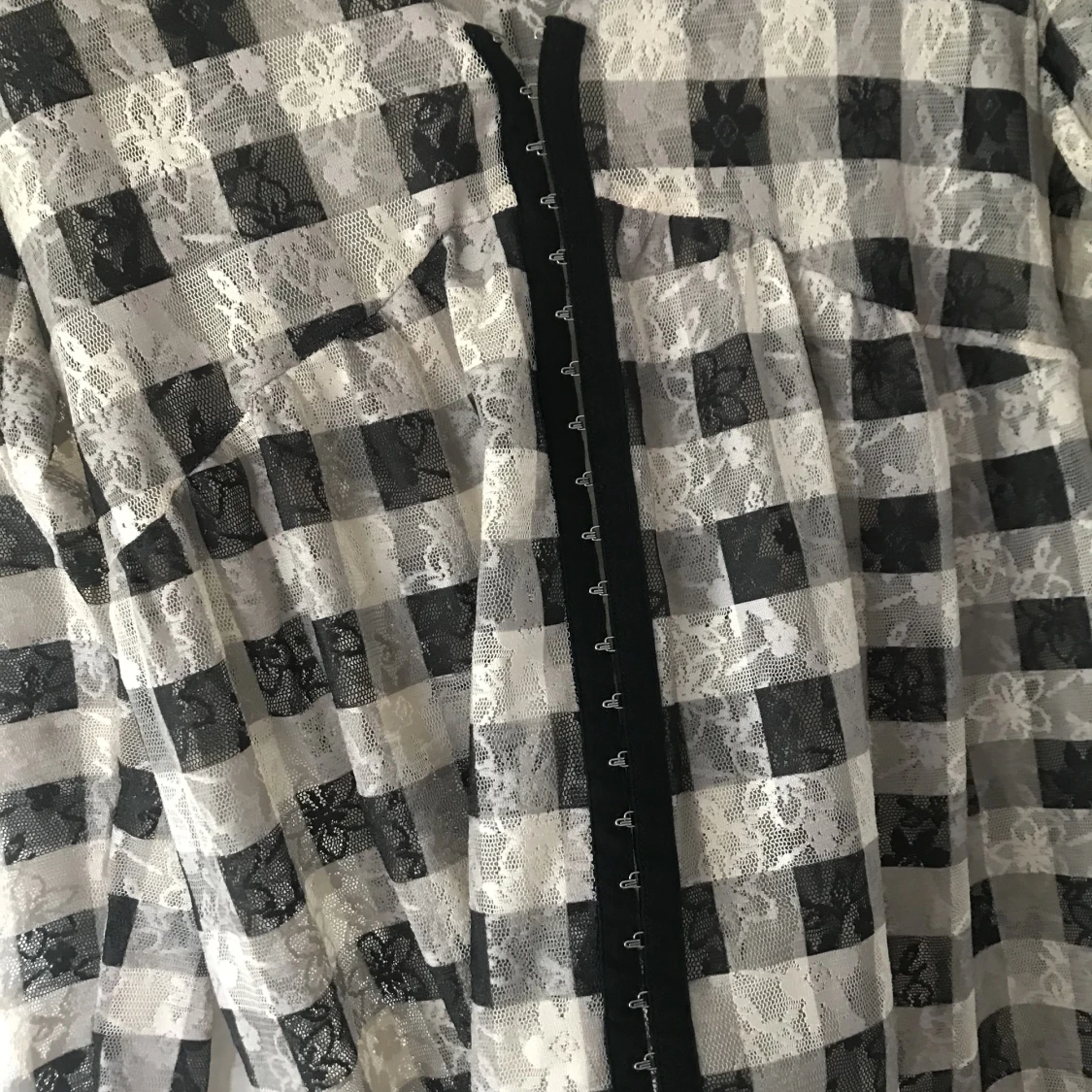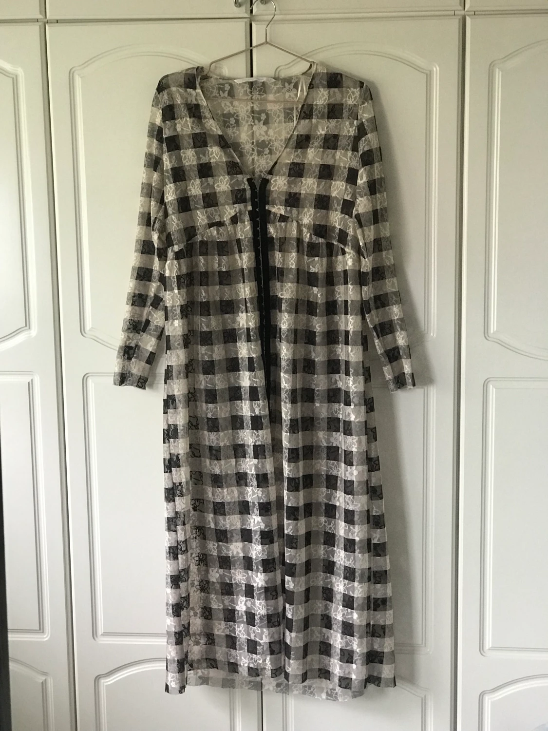 Lång, rutig cardigan i spetsmaterial. Tunn. Använd en gång. Lös passform men tight runt armarna. Hör av dig om du vill ha fler bilder 🙏