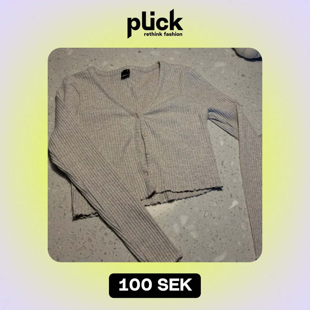 Säljer en stilren grå/beige ribbad kofta från Gina Tricot. Koftan har en v-ringad design med knappar framtill och är croppad för en modern look. Perfekt för lager-på-lager under kyligare dagar. Sitter definitivt som en M