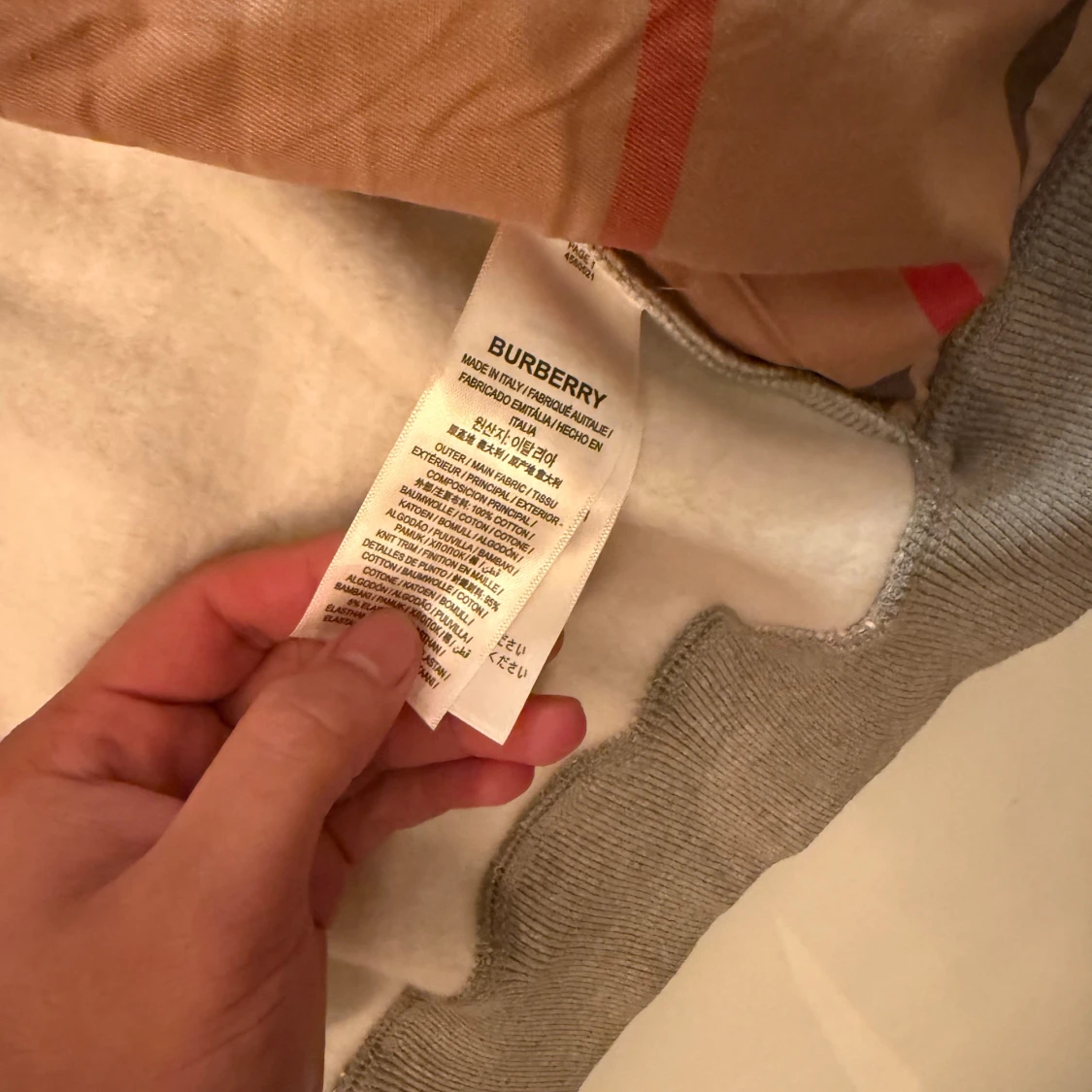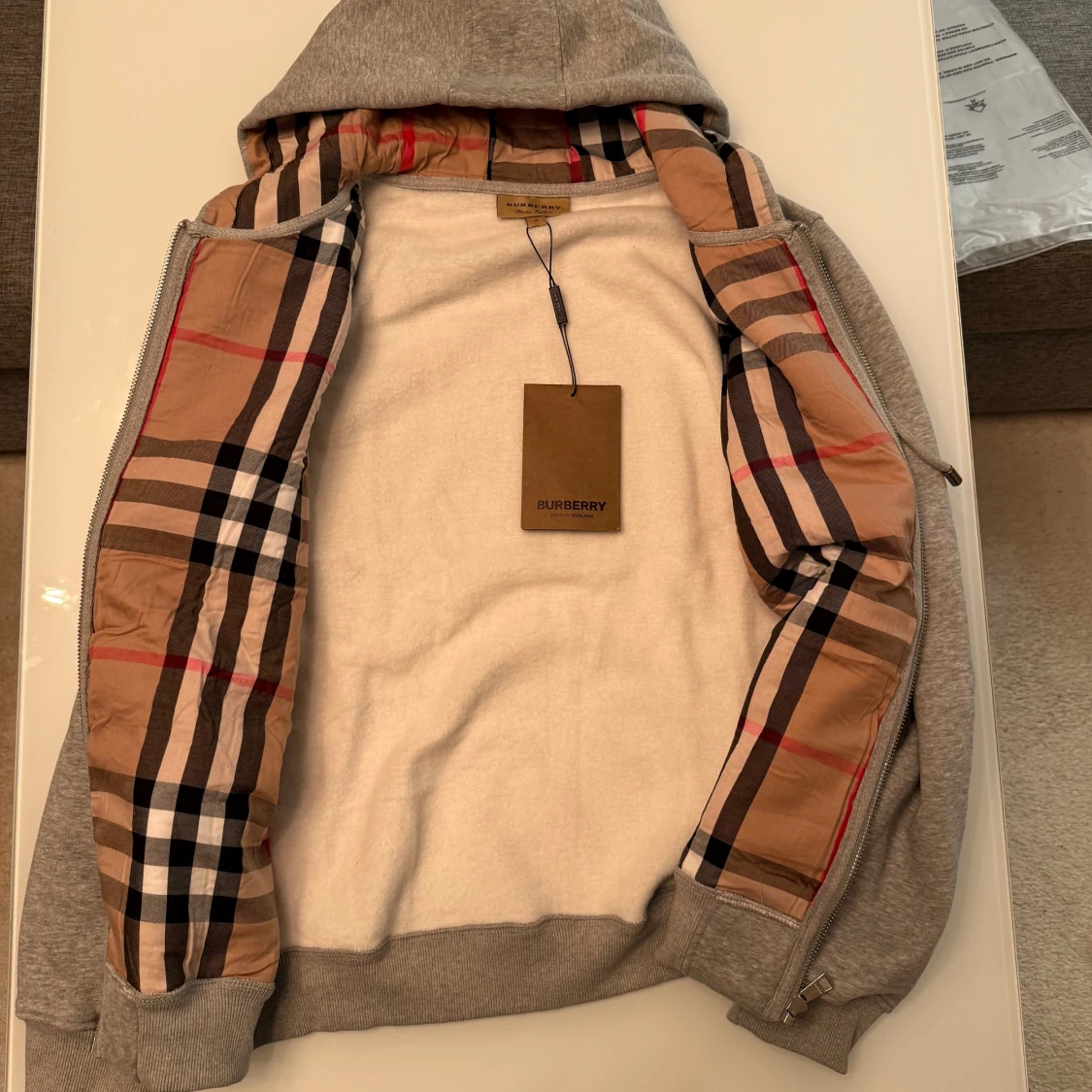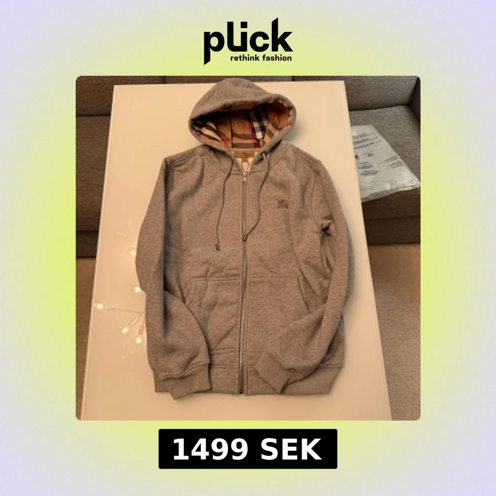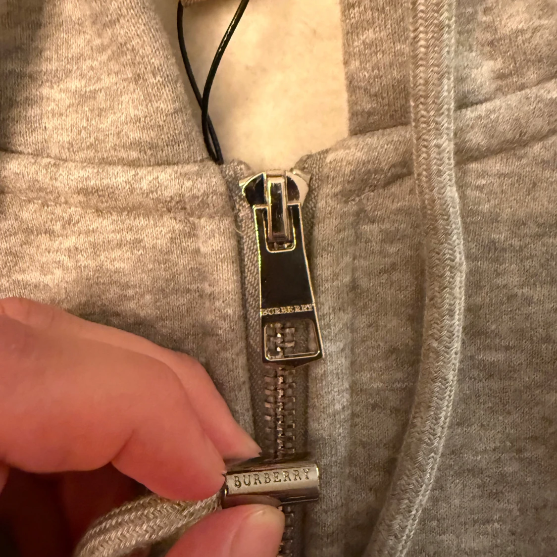 Snygg grå hoodie från Burberry med klassiskt rutigt foder i huvan och insidan. Tröjan har dragkedja framtill, snörning i huvan och två fickor. Tillverkad i mjuk bomullsmix och har ribbade muddar vid ärmslut och nederkant. Perfekt för en chill och stilren look.