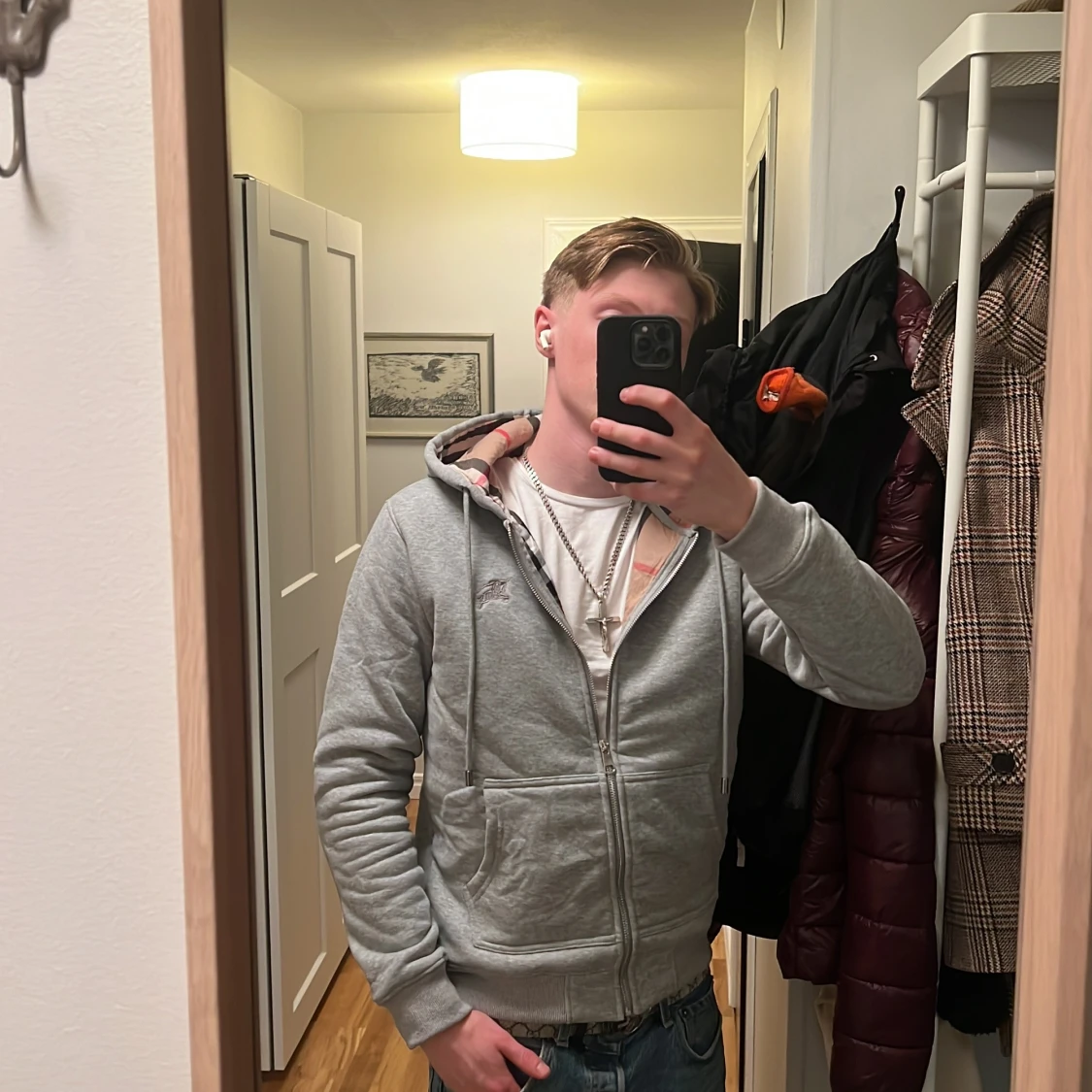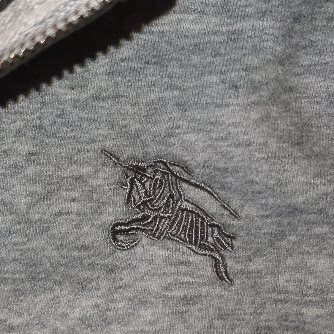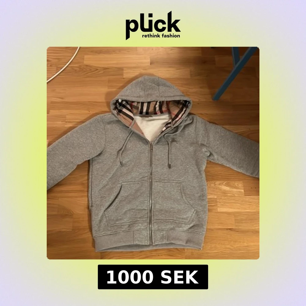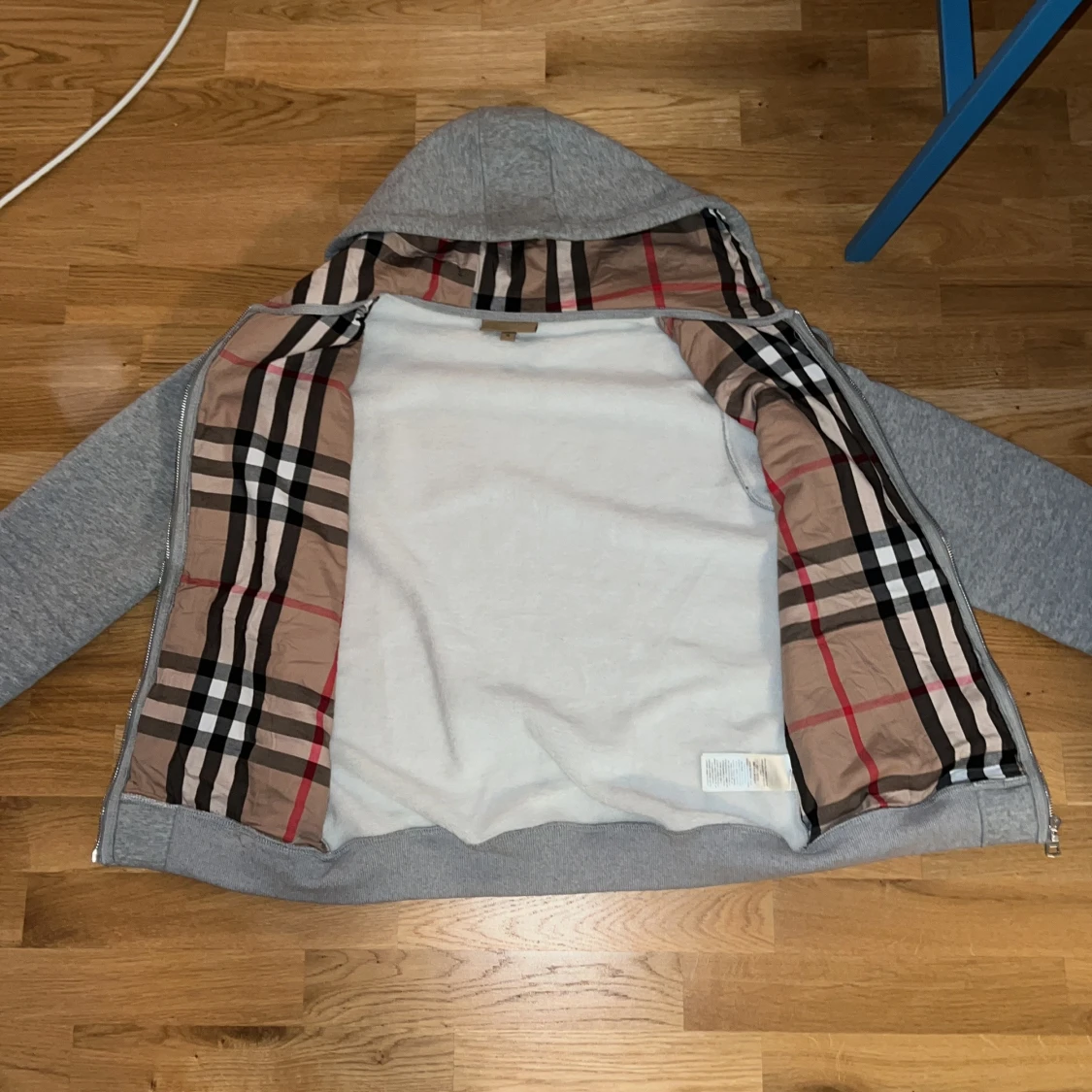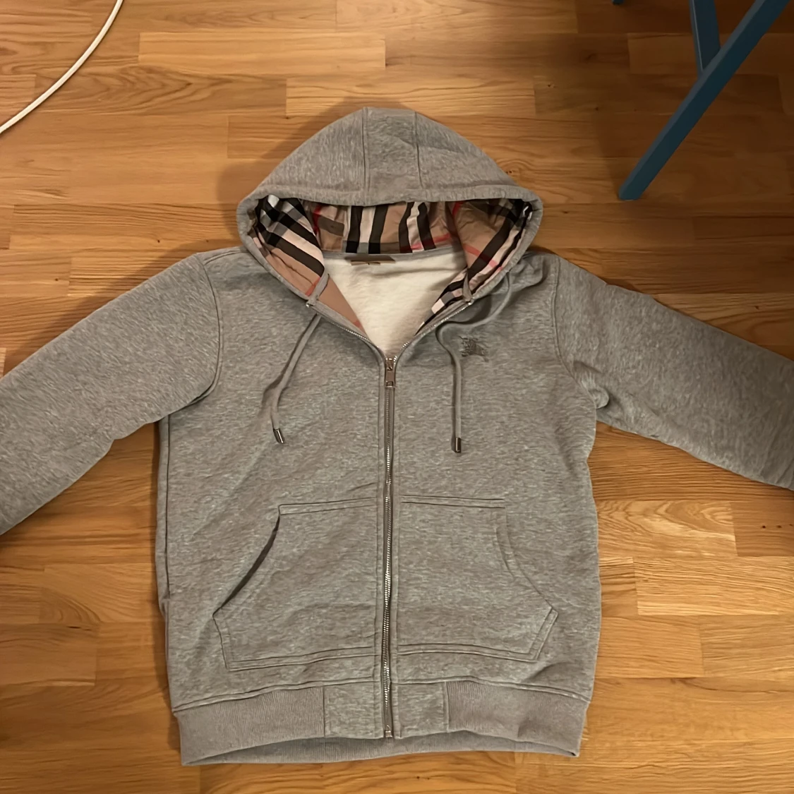 Säljer en grå hoodie från Burberry med klassiskt rutigt foder i huvan och insidan. Tröjan har dragkedja, snörning i huvan, två fickor fram och broderad Burberry-logga på bröstet. Perfekt för dig som gillar stilren streetwear med lyxig touch.