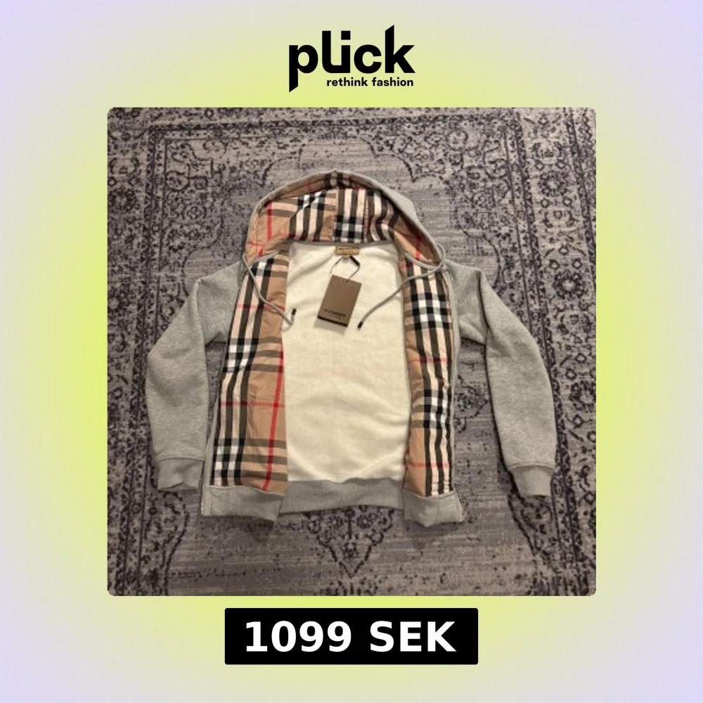 Snygg grå hoodie från Burberry med dragkedja och huva. Insidan av huvan och öppningen har det ikoniska Burberry-rutmönstret i beige, svart, vitt och rött. Broderad logga på bröstet och praktiska fickor framtill. Perfekt för dig som vill ha en stilren och lyxig look. Obs! Prislapp medföljer inte.