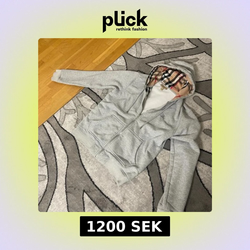 Grå hoodie från Burberry i storlek L med dragkedja och snörning. Insidan av huvan har klassiskt Burberry-rutigt mönster i beige, svart, vit och röd. Tröjan har broderad logga på bröstet och två fickor framtill. Perfekt för dig som gillar stilrena streetwear-plagg.