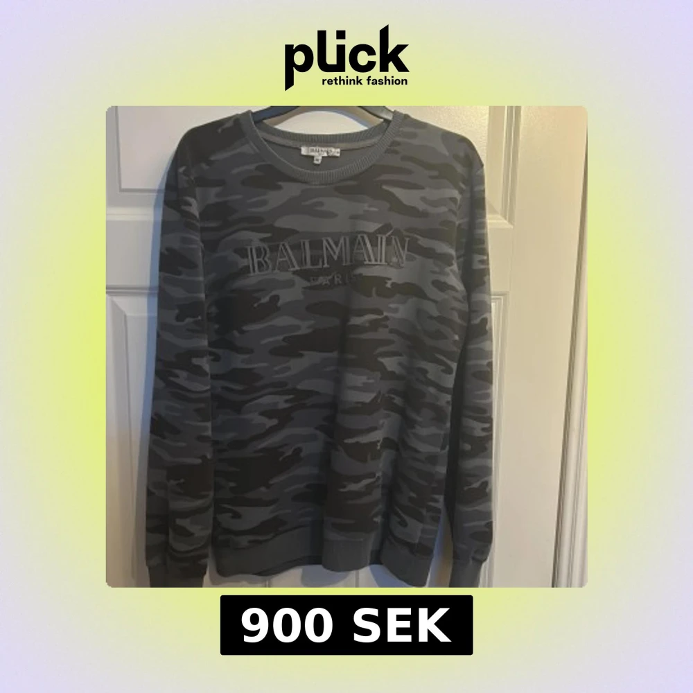 Säljer en snygg grå camouflagemönstrad tröja från Balmain. Tröjan har en rund halsringning och långa ärmar. Perfekt för en stilren och modern look.
