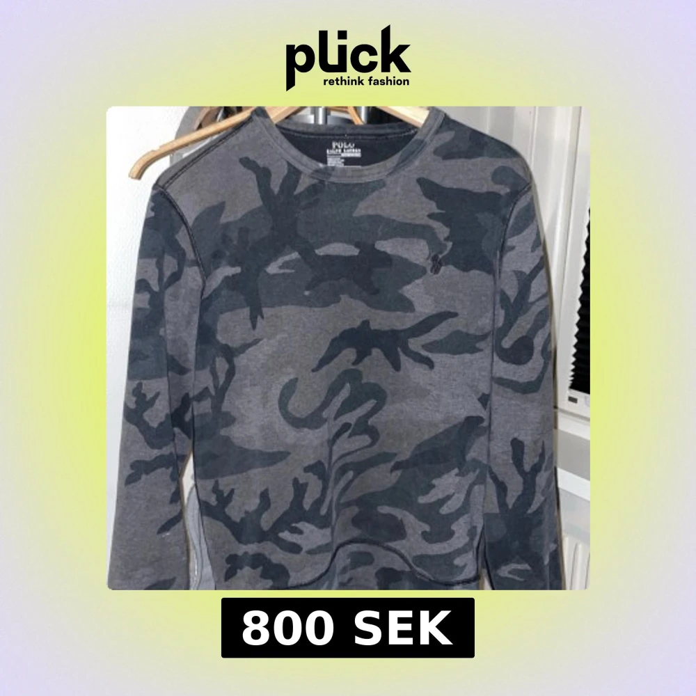 Säljer en grå camouflagemönstrad tröja från Polo Ralph Lauren. Tröjan har långa ärmar och en rund halsringning, perfekt för en avslappnad stil. Den är en del av deras Performance-kollektion.