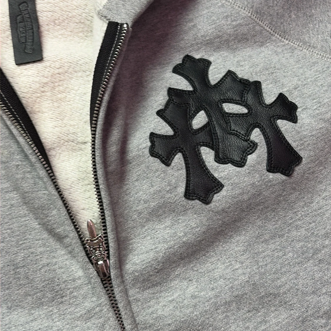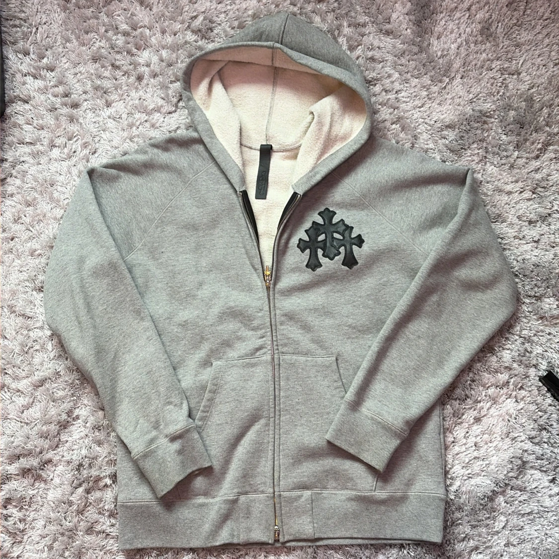 NÄSTAN OANVÄND - Säljer en grå zip hoodie från Chrome Hearts med svart läder i form av kors på bröstet. Tröjan har huva, hel dragkedja med detaljerad silver zip och mjukt, ljust foder. Praktisk känguruficka framtill och ribbade muddar.Väldigt varm! Perfekt för kommande vädret. Perfekt för dig som gillar streetwear med en elegant touch. Storlek M, dock är den på den långre sidan