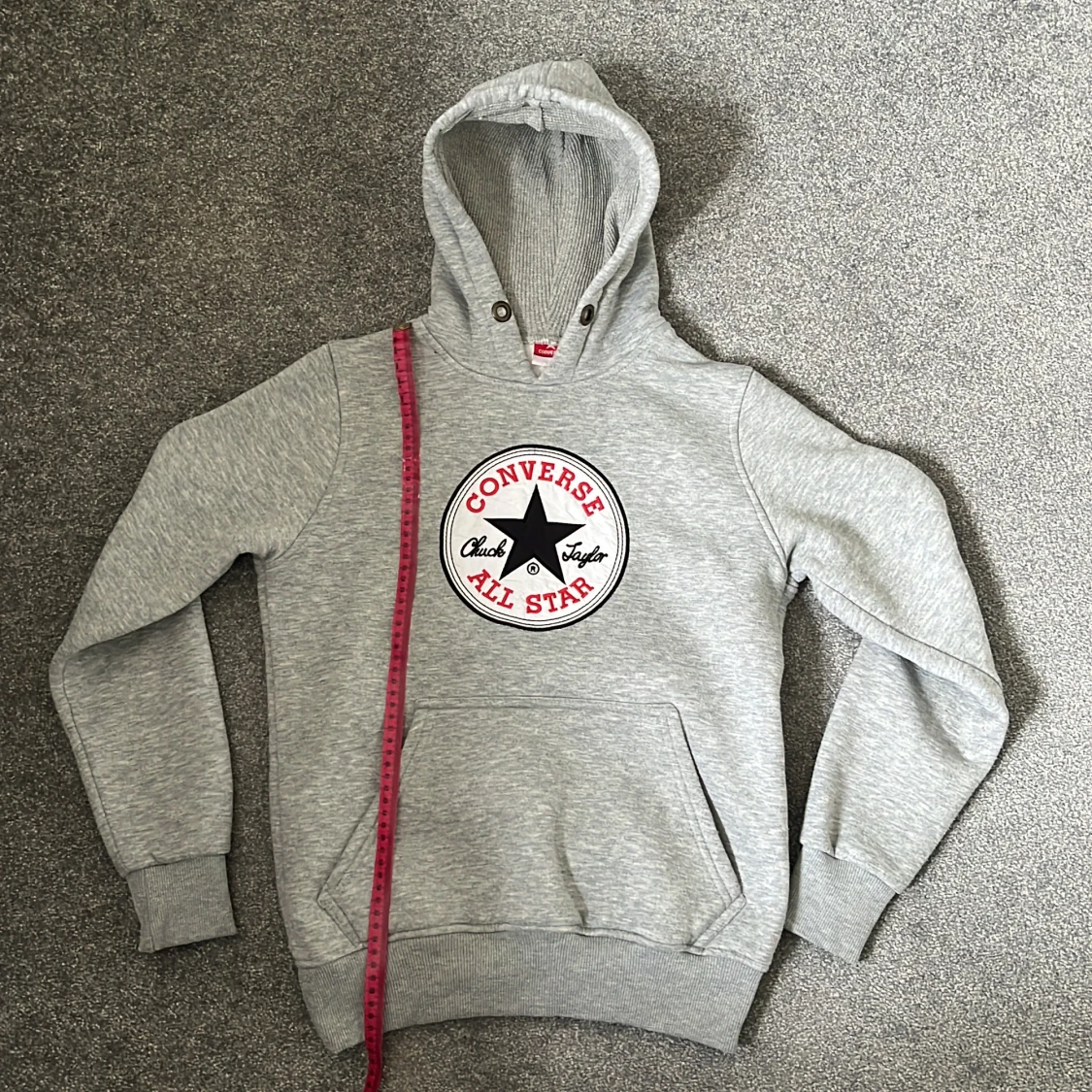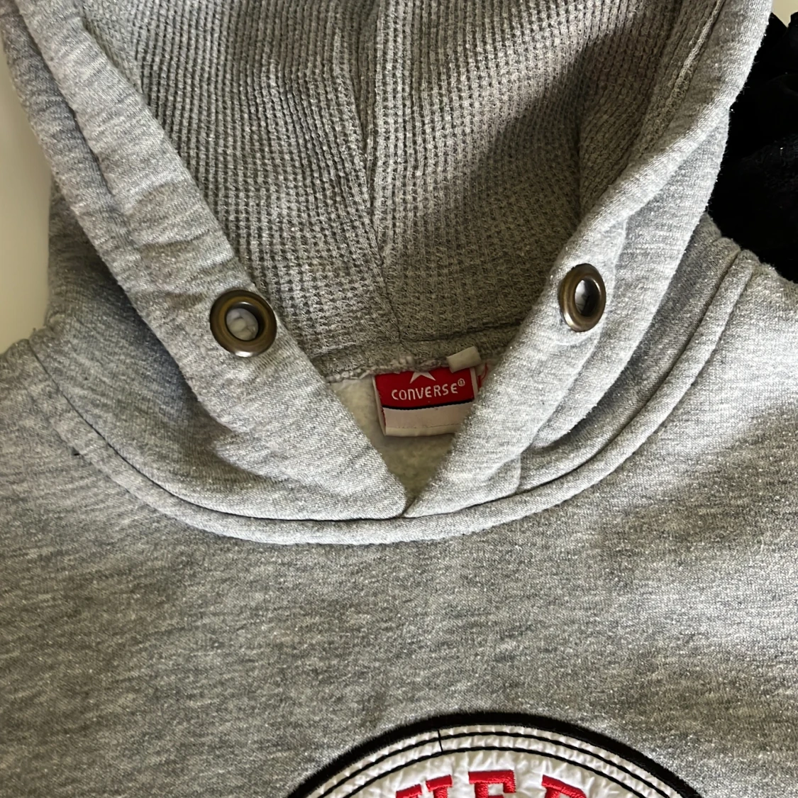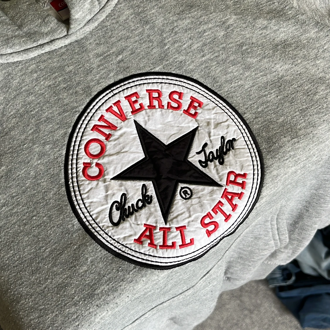 Snygg grå hoodie från Converse med stor broderad All Star-logga på bröstet. Tröjan har huva med metallöljetter, ribbade muddar och magficka. Mjuk insida och klassisk loose passform. Materialet är bomull och polyester. Tröjan är 62 cm lång. Det står ingen storlek i tröjan men tycker att den passar som xs/s