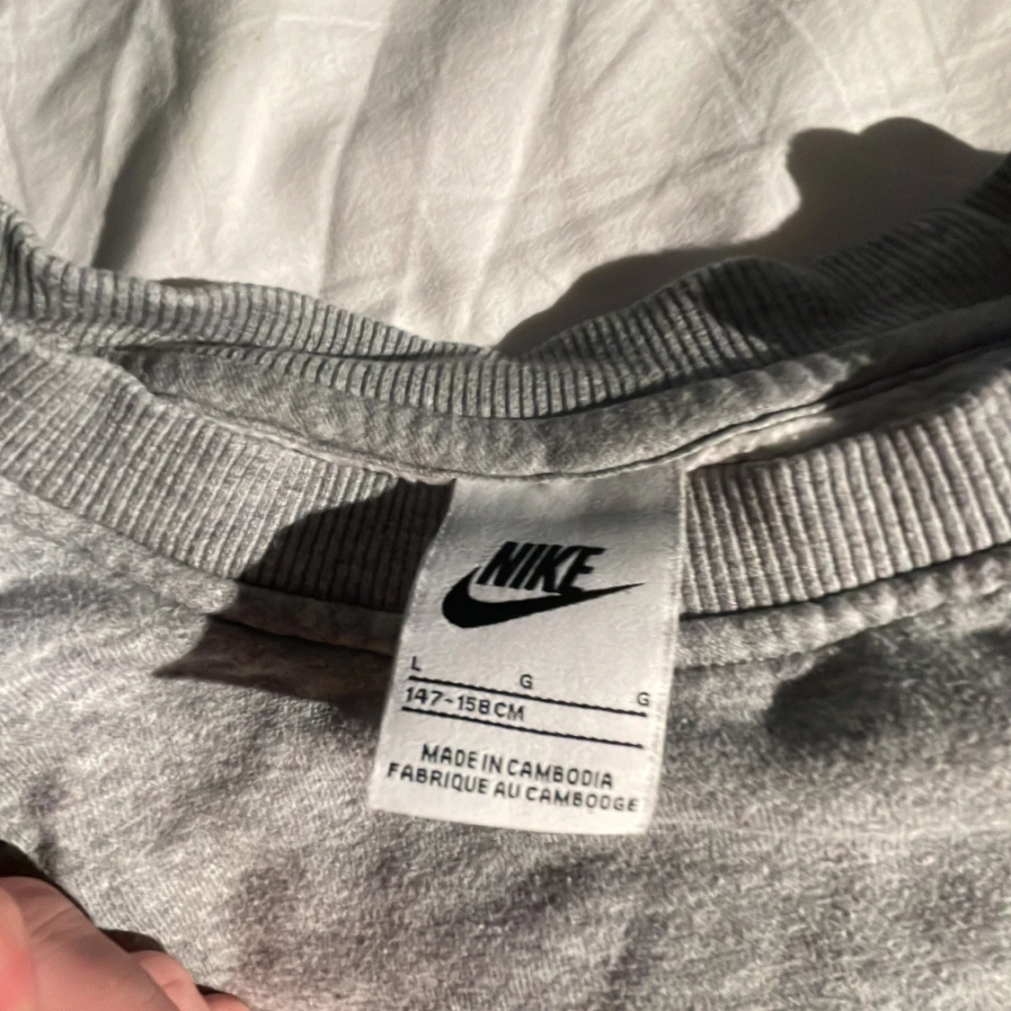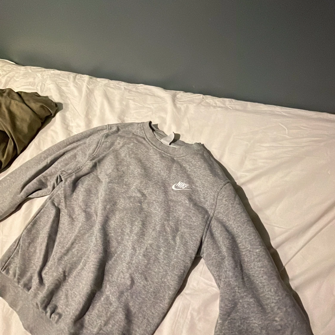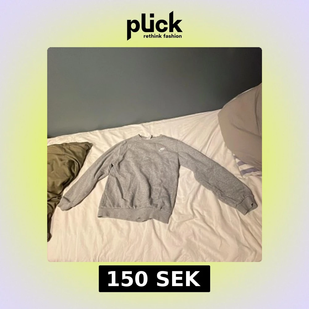 Säljer en stilren grå crewneck från Nike med klassisk logga på bröstet. Tröjan har rund hals, ribbade muddar och är tillverkad i mjuk bomullsblandning. Perfekt för chill dagar eller när du vill ha en clean look.