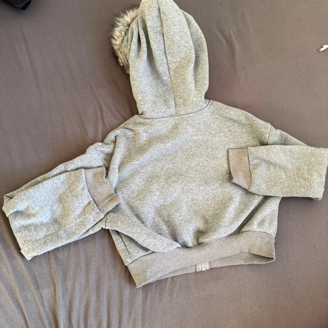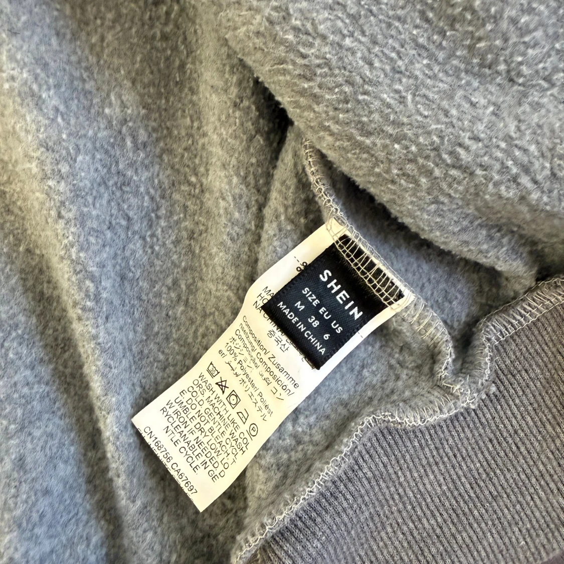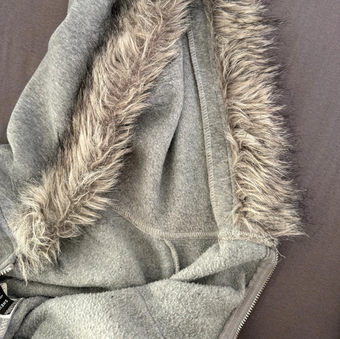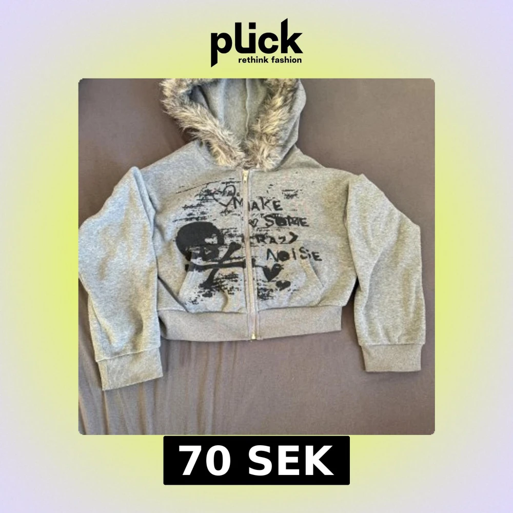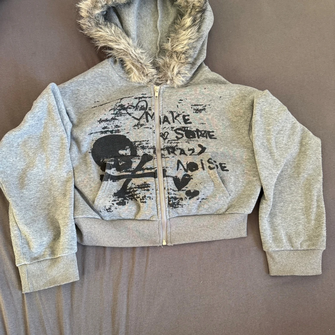 Grå croppad hoodie från SHEIN med svart tryck framtill och texten 'Make Some Crazy Noise'. Hoodien har dragkedja, långa ärmar, mjuk fuskpäls i luvan och bred mudd i midjan. Perfekt för dig som gillar streetstyle och vill sticka ut.