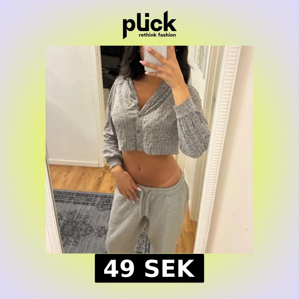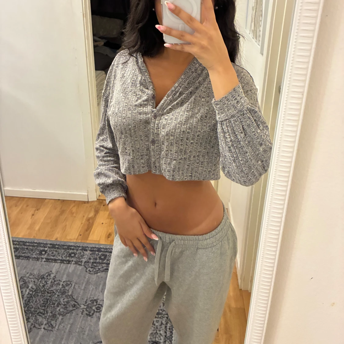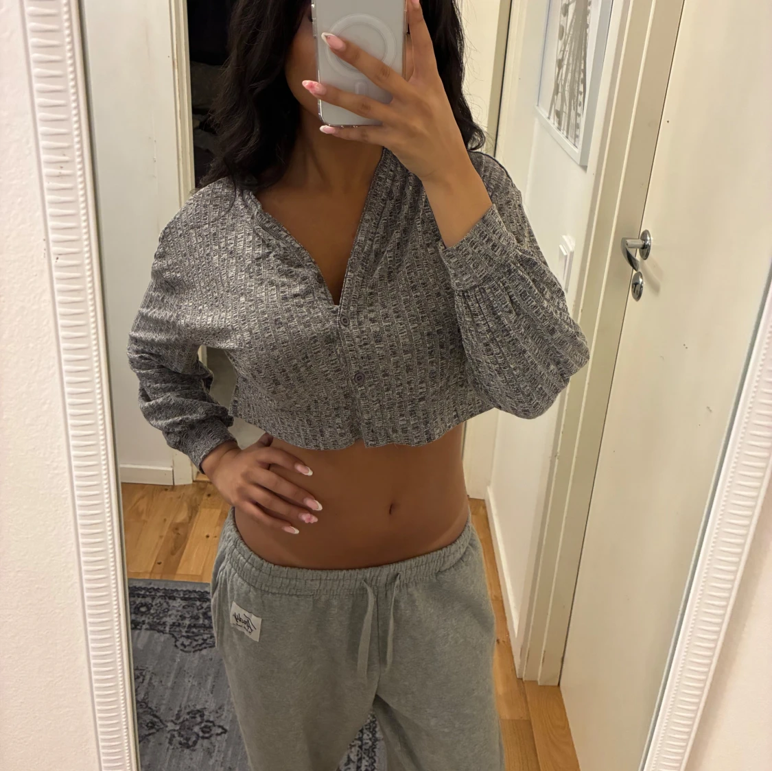 Grå croppad kofta med ribbad struktur och knappar framtill. Tröjan har lång ärm och en loose passform som ger en chill vibe. Perfekt att styla med höga byxor eller över ett linne. Enkel och stilren design som passar till många outfits.