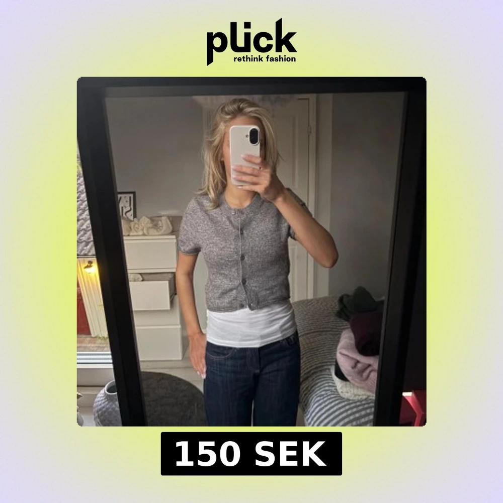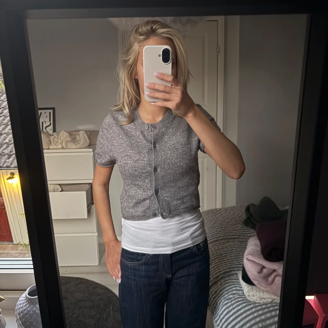 Grå, croppad kofta med korta ärmar och rund hals. Koftan har knappar framtill och är stickad i ett mjukt material som känns skönt mot huden.