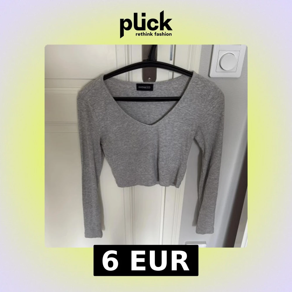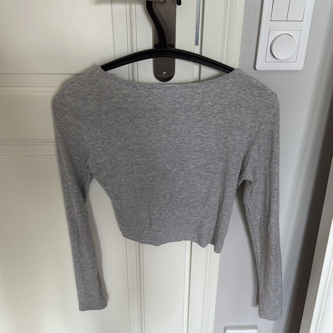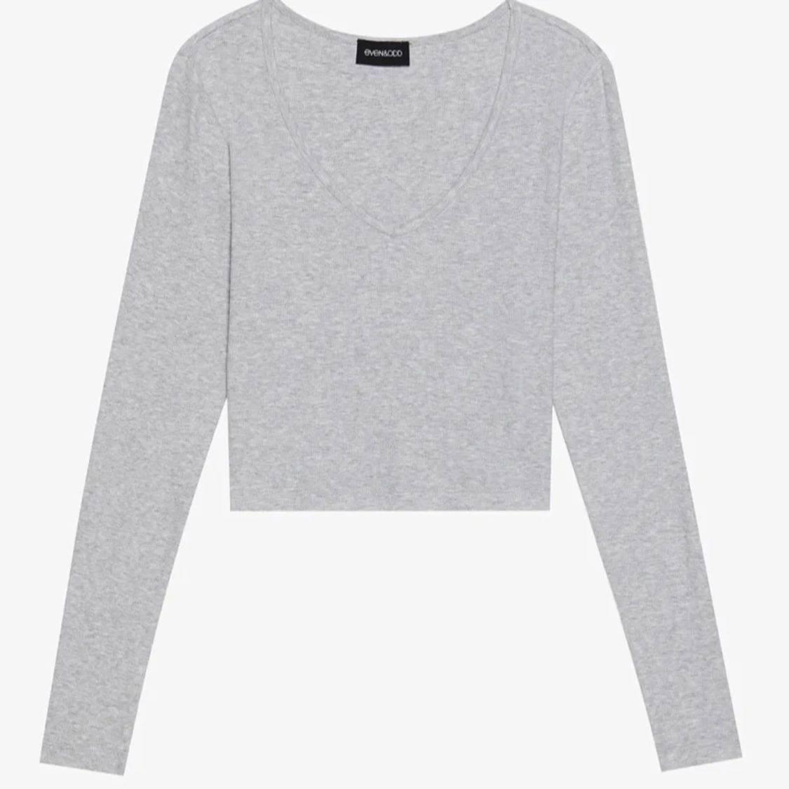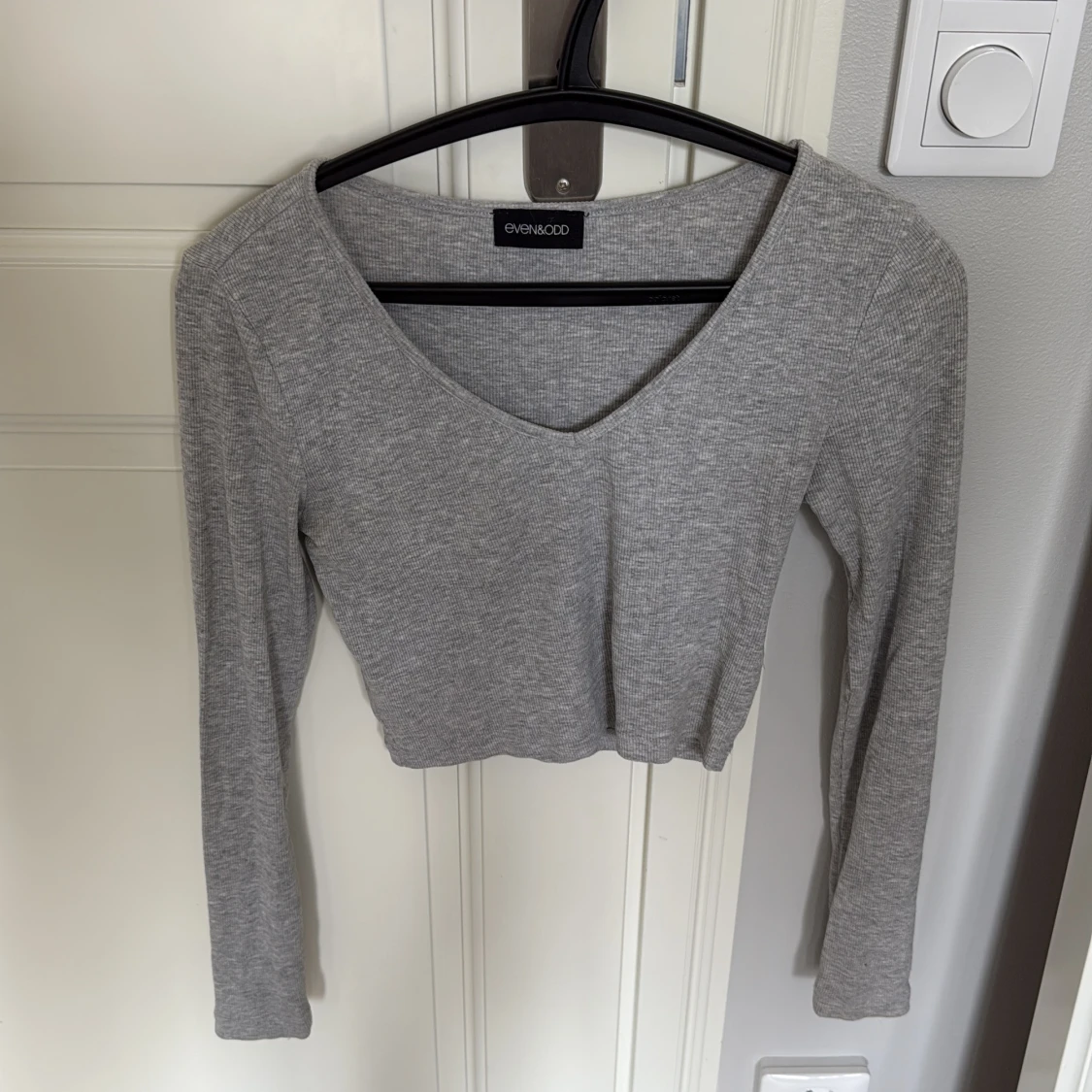 Säljer en ljusgrå croppad topp från Even&Odd med v-ringning och långa ärmar. Toppen är ribbad och har en slim passform som sitter snyggt på kroppen. 🩶