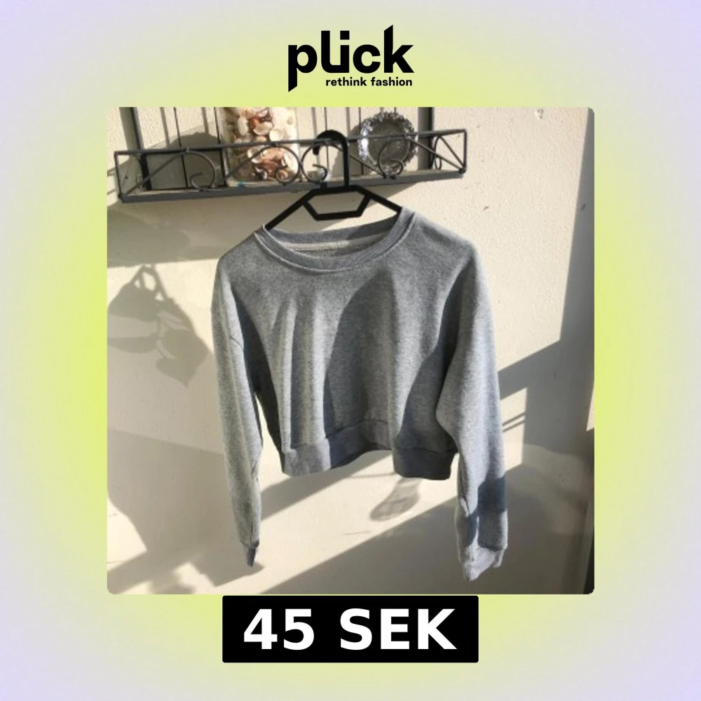Enkel och basic grå croppad sweatshirt med rund halsringning och långa ärmar. Tröjan har ribbade muddar vid ärmslut och nederkant. Den är S men är typ S/M oxå. den är gjord i lite tunnare bomull. så pssar bra på sommarn oxå
