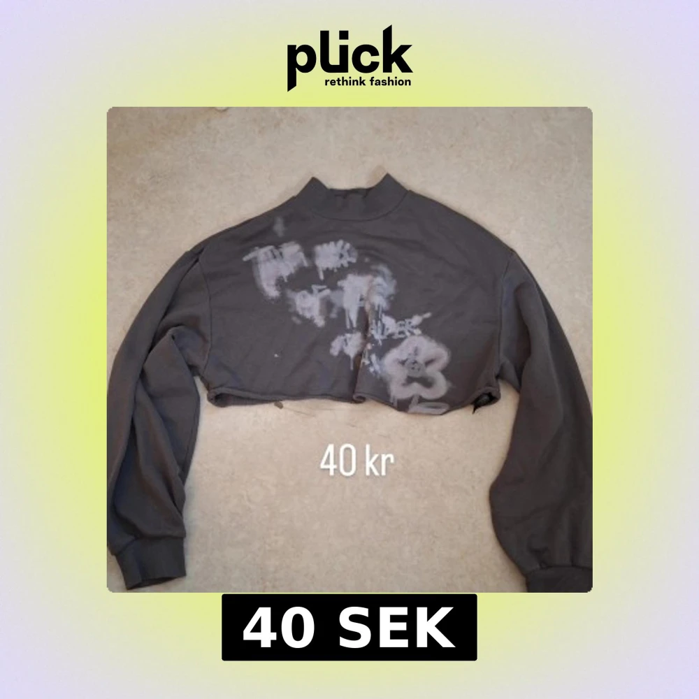Grå croppad sweatshirt med rå kant och unikt graffiti-inspirerat tryck i vitt och ljusrosa framtill. Tröjan har lång ärm och ribbad mudd vid ärmslut samt högre krage. Perfekt för en edgy streetstyle-look.