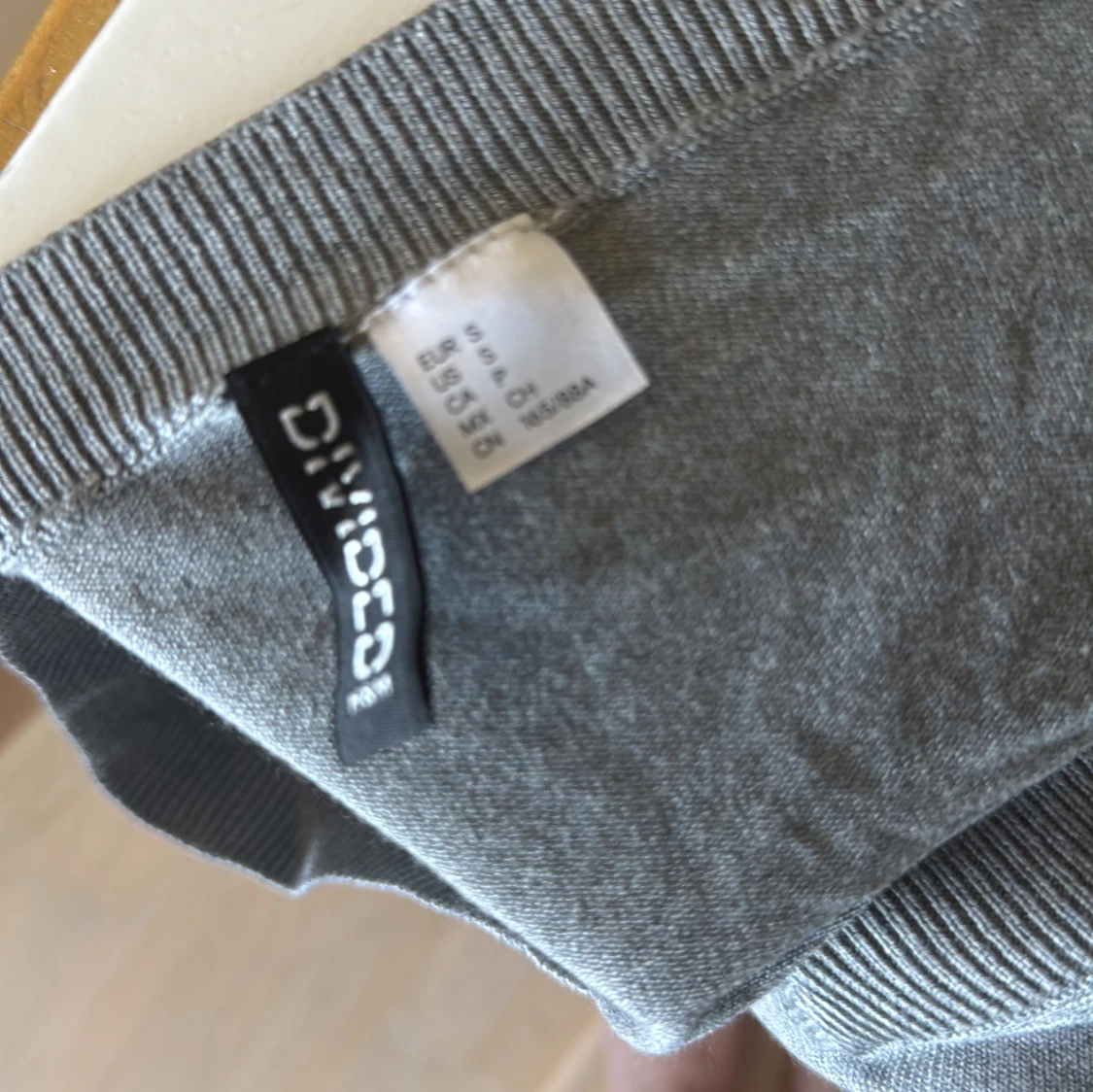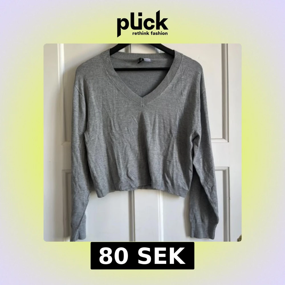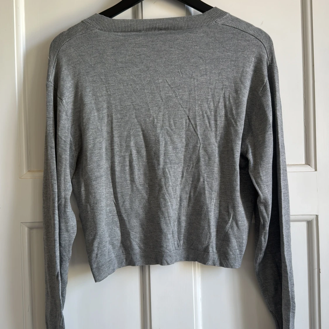 Säljer en grå croppad tröja från Divided med v-ringning och långa ärmar. Perfekt för lager-på-lager och enkel att matcha med olika outfits. Mjuk och bekväm med ribbade muddar vid ärmslut och hals.