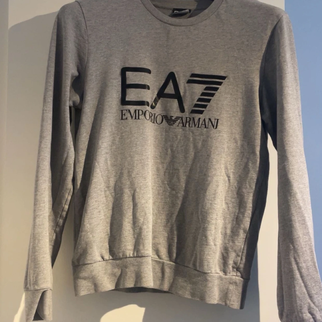Snygg grå sweatshirt från EA7 Emporio Armani med svart logotyp tryckt på bröstet. Tröjan har rund hals, långa ärmar och är tillverkad i mjuk bomull. Perfekt för dig som gillar stilrena och klassiska märkesplagg med en sportig vibe.