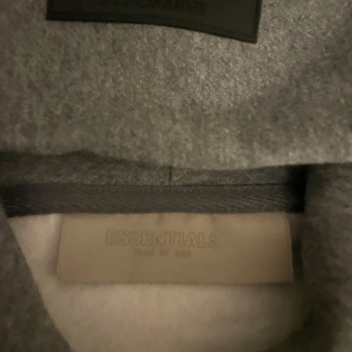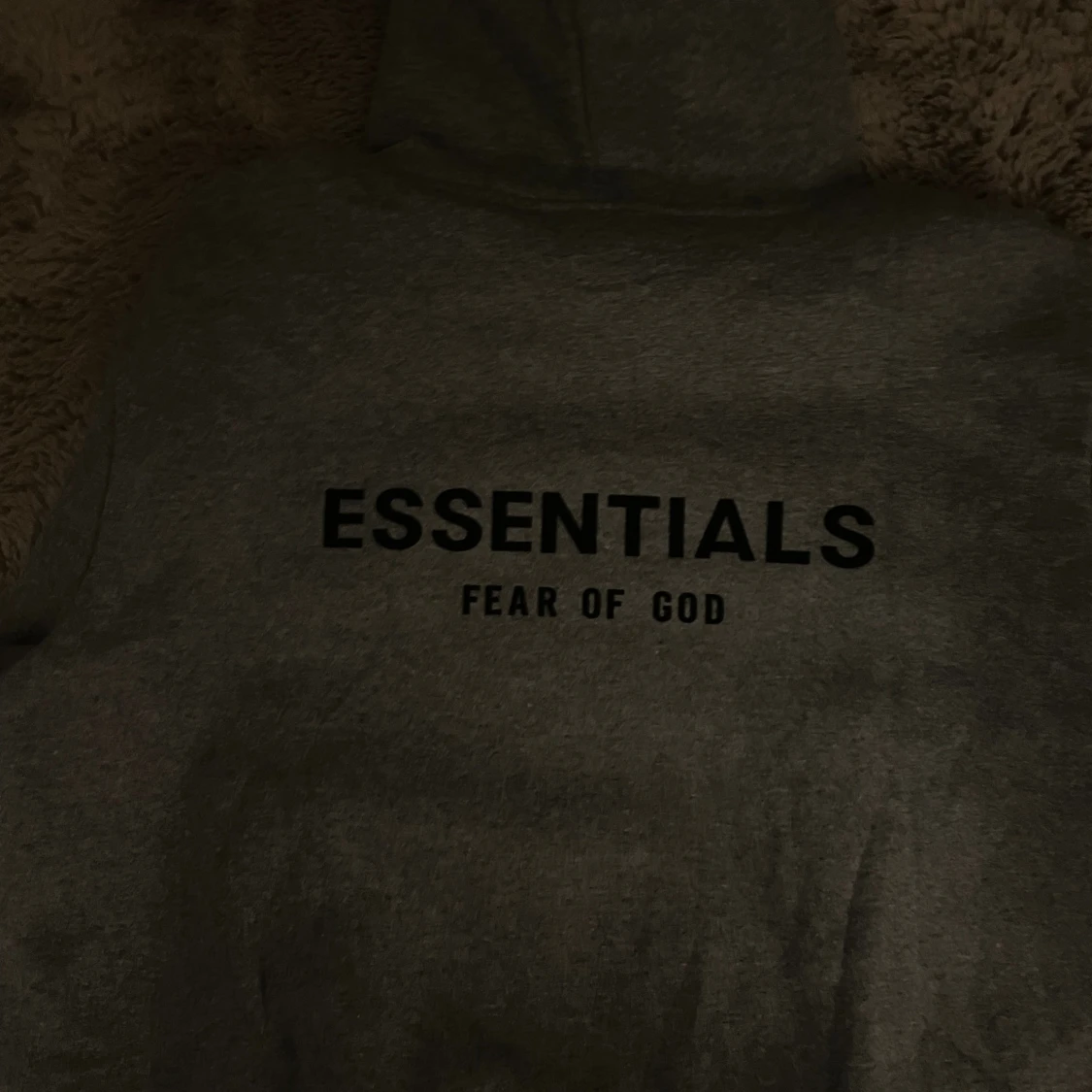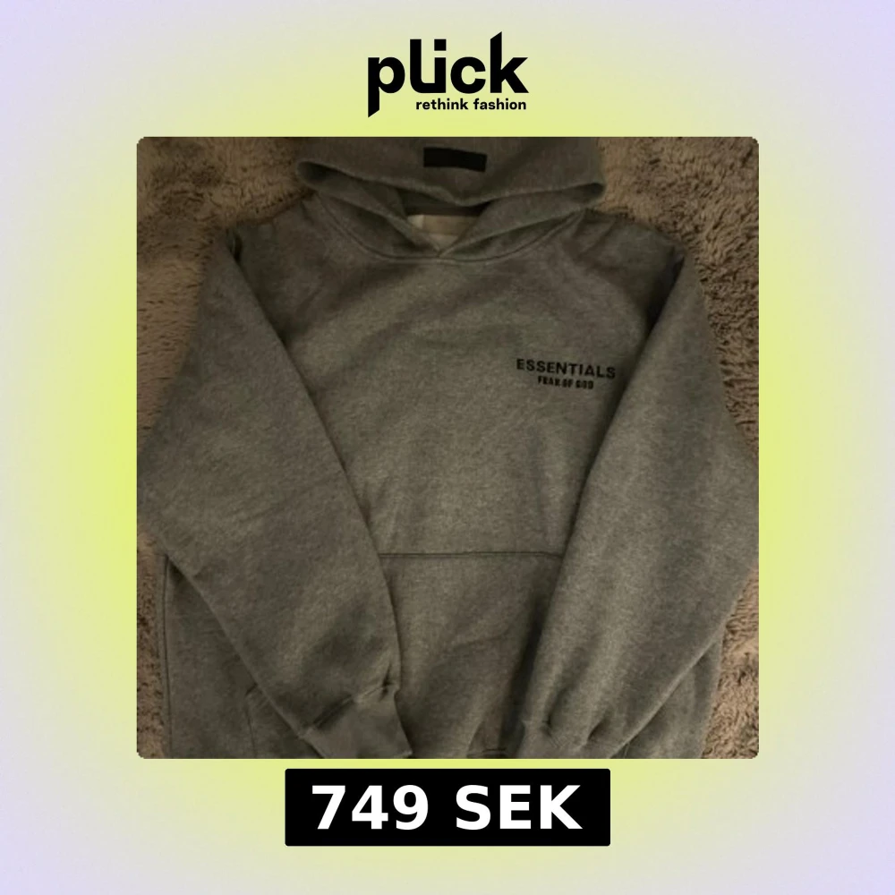 Säljer en grå hoodie från Essentials Fear of God med svart logga på bröstet och ryggen. Klassisk oversized passform, stor huva och magficka. Perfekt för dig som gillar streetwear och vill ha en stilren look.