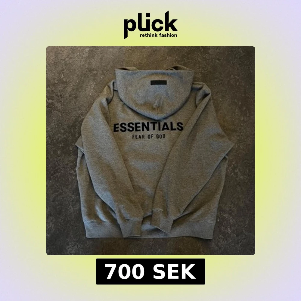 Säljer en grå hoodie från Essentials Fear of God i storlek M. Tröjan har svart tryck på bröstet, huva och ribbade muddar. Materialet är mjuk bomullsmix med 80% bomull och 20% polyester. Perfekt för en chill och stilren look.